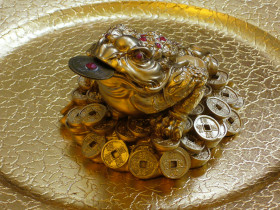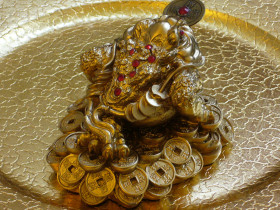 Und was habe ich mir als Souvenir aus China Town mitgebracht? Natürlich eine Feng-Shui-Kröte. Sie soll im Zimmer in der Geld-Ecke stehen (wenn du durch die Tür kommst gleich links hinten) oder aber auf dem Scheibtisch und den Sitzenden anschauen. Das bringt gaaaaaanz bestimmt viel materiellen Wohlstand. Aber mal im Ernst: Die Chinesen haben unglaublich viele goldene Glücksbringer, die Wohlstand bringen sollen. Keine andere Kultur betet so ungeniert um Knete.Die Feng-Shui-Kröte sitzt natürlich auf einem Haufen chinesischer Goldmünzen (manchmal auch auf Schiffchenbarren). Und weil 4 eine Unglückszahl, 3 aber eine göttliche Zahl ist, hat sie natürlich nur drei Beine. Ich liebe sie! Sie hat was von der Hypnose-Kröte bei Futurama...