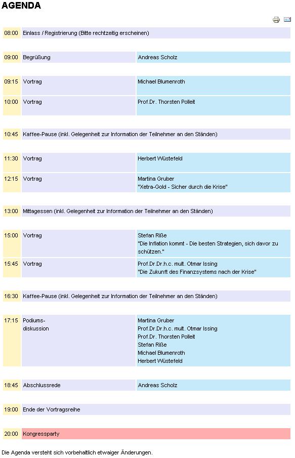 Der Vortrag war sehr gut für Anfänger gestrickt, langsame Einführung und dann wurden immer mehr Details hinzugefügt (zB wurde erst mit Nomialen hantiert, dann mit inflationsbereinigten Zahlen und dann mit Shadow Stats). Fragen wurden hauptsächlich in der Pause und nach dem Seminar bilateral oder in kleineren Gruppen diskutiert. Es wurden auch diverse Internetseiten empfohlen (GS, kitco, shadowstats, etc) und vor all zu Schwarzsehenden in den Foren gewarnt (zB bunkerbauende Lebensmittelhorter mit Waffe im Anschlag). Man sollte irgendwo in der Mitte bleiben.