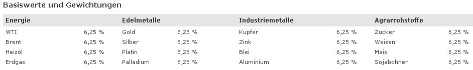 (ETF: ComStage Commerzbank Commodity EW Index TR , LU0419741177 , thesauriered, swap)Der Commerzbank Commodity EW Index TR ist ein Index, der die Wertentwicklung von 16 Rohstoffen nachvollzieht, die durch Terminkontrakte abgebildet werden. Aktuelle Indexkompenenten sind WTI Rohöl, Brent Rohöl, Heizöl, Erdgas, Gold, Silber, Platin, Palladium, Kupfer, Zink, Blei, Aluminium, Zucker, Weizen, Mais und Sojabohnen. Diese Rohstoffe stellen zum Zeitpunkt der Auflage einige der liquidesten und bedeutendsten Rohstoffe dar. Der Index spiegelt die Gesamtrendite eines Investments in die darin enthaltenen Rohstoffe wider („Total Return Index“) und wird auf der Basis der täglichen Referenzpreise der verschiedenen Terminkontrakte berechnet. Der Index wird von der Commerzbank oder einem Rechtsnachfolger (die „Indexberechnungsstelle“) in der Regel täglich berechnet und veröffentlicht. Die Indexberechnungsstelle wird zweimal pro Jahr die Gewichte auf die