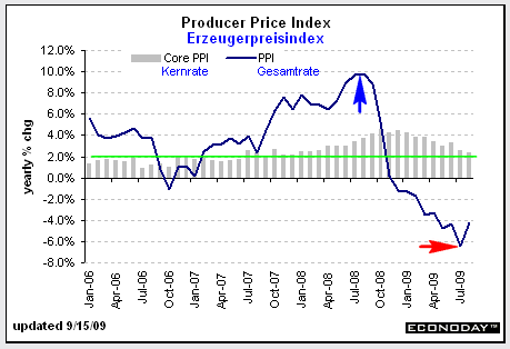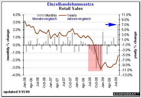 Die Einzelhandelsumsätze wiesen im August mit +2,7% (blauer Pfeil) den stärksten Anstieg in drei Jahren auf. Die Abwrackprämie im Autosektor und höhere Benzinpreise waren die wesentlichen Gründe hierfür. Aber auch ohne diese beiden Faktoren stiegen die Umsätze im August um 0,6%% im Vergleich zu -0,4% in Juli. Die ausgeprägte mehrmonatige Schwäche (rosa Markierung) während der zweiten Jahreshälfte von 2008 ist offensichtlich überwunden, auch wenn die Einzelhandelsumsätze immernoch 5,3% unter dem Vorjahresniveau liegen. Entscheidend ist jetzt, wie stark der Erholungstrend in vierten Quartal sein wird. Hier gehen die Meinungen deutlich auseinander. Der Verbraucher hat nach wie vor nicht genügend Geld, um aus eigener Kraft den Wirtschaftsaufschwung entscheidend zu stimulieren. Hohe Arbeitslosigkeit und deutliche Verluste am Immobilienmarkt bleiben kaum zu überwindende Hürden, sodass die Erholung ohne zusätzliche Stimulanzprogramme bescheiden ausfallen wird.
