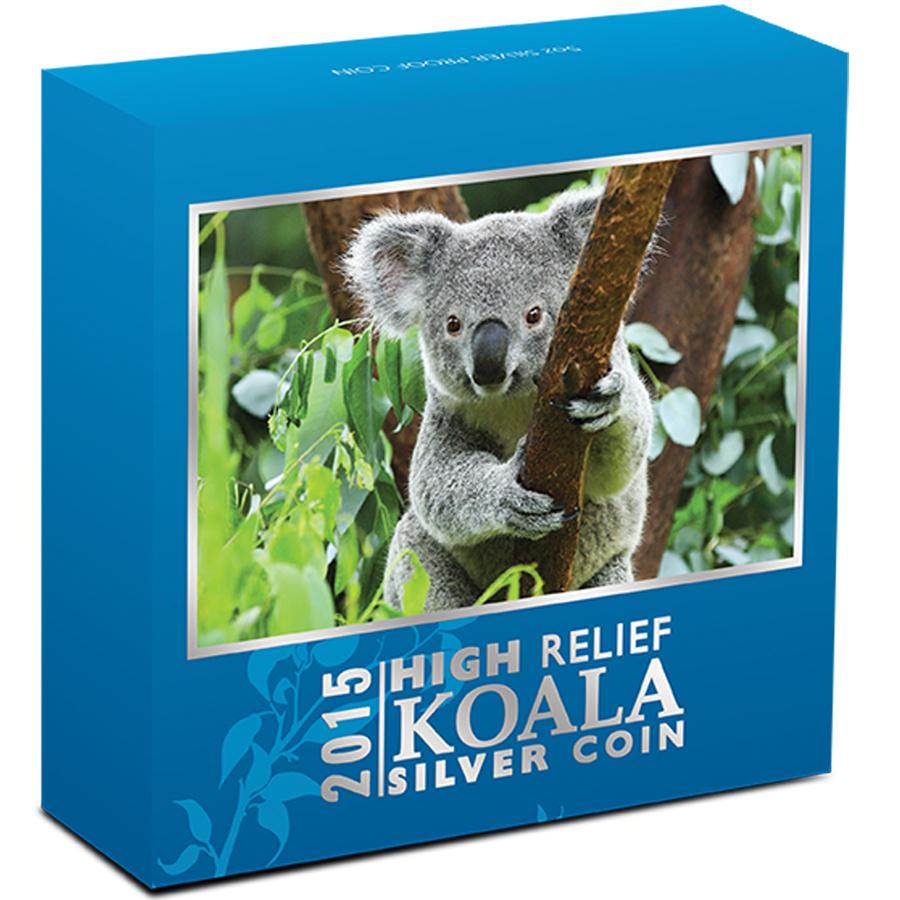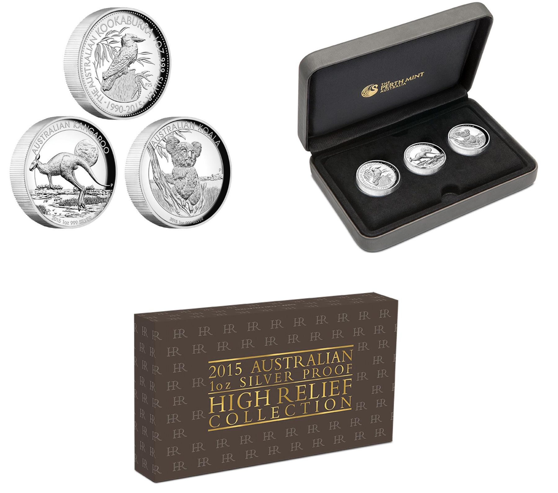 die Australian High Relief 2015 Silver Proof Three-Coin CollectionDas Set besteht aus den drei 2015 1oz Silber High Relief Münzen Koala, Kookaburra und Kangaroo,