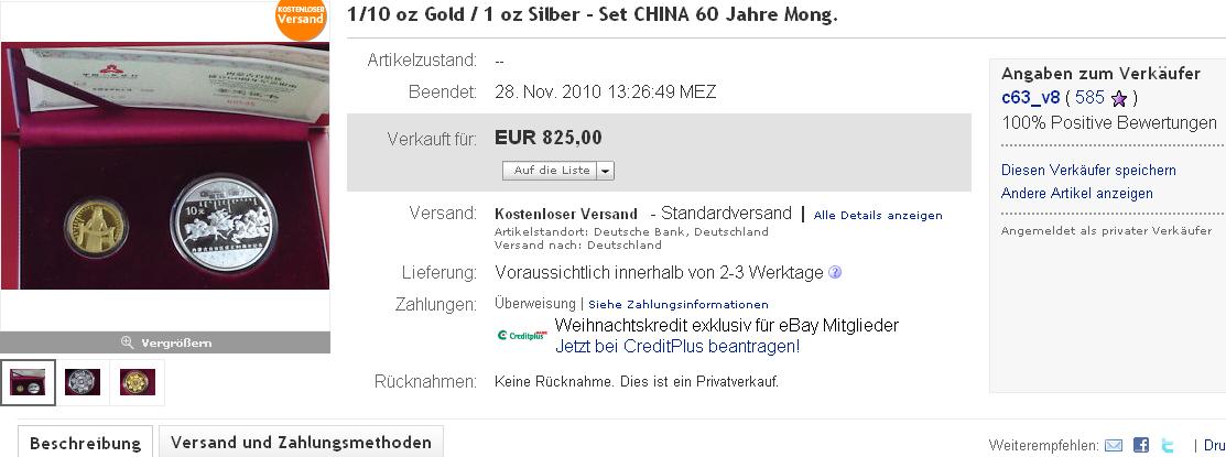 Noch eine Zahl, für das gesamte Jahr 2010 standen 11.600 Kilomünzen AG (Panda+Grotto+Hase) zur Verfügung. Nach jüngsten Berichten geht der Silberexport in China um gut 2.000 to zurück. Sagen wir mal, das ist nur zu einem Drittel erhöhte Inlandsnachfrage nach Silberanlageprodukte, wie Barren, die für diesen Rückgang verantwortlich sind. Dann wurden knapp 700 to mehr in diesem Jahr nachgefragt als sonst - und weil ich immer übertreibe und pushe - nehmen wir jetzt von diesem Drittel nur 10 %, die in zusätzliche Medaillien und Barren von Bankausgaben, etc. gewandert sind. Dann wurde der chinesische Markt, an den obigen Münzausgaben vorbei, mit 70 to = 70.000 Kilo versorgt. Zusätzlich standen von den obigen 11,6 to Kilo Münzen, villeicht 2/3 unmittelbar (nicht Export) für den Heimatmarkt zur Verfügung. also 7,5 to - da würd ich mich über die Preise nicht wundern.