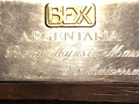 2. Ist in jeder Hinsicht interessant. Zunächst das Gewicht: 345 Gramm. Hergestellt wurde er von Joyeros M. Yañez. Der Familenbetrieb Yañez ist jedenfalls ein seit der Mitte des 19. Jahrhunderts in Madrid ansässiger Schmuckhersteller, weshalb ich mal darauf tippe. Die Rückseite verrät uns das Alter. BEX Argentaria war ein Konstrumt spanischer staatlicher Banken. Die Holding Argentaria wurde 1991 gegründet und erwarb unter anderem die staatlixhe Banco Exterior (BEX). 1999 wurde das Ganze überführt in die heutige BBVA. Irgendwann dazwischen hatte Maria Rosa Agosti ihr 25-jähriges Firmenjubiläum.