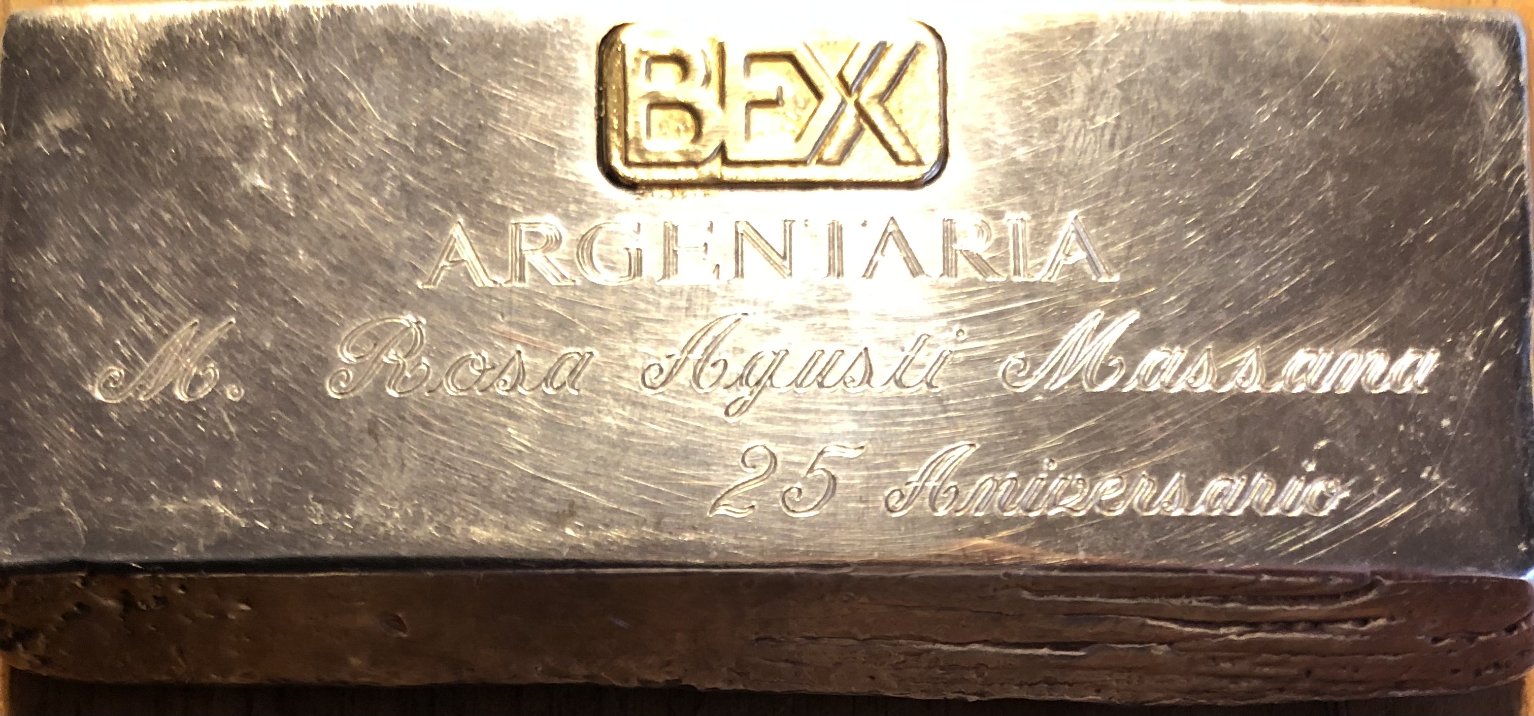 2. Ist in jeder Hinsicht interessant. Zunächst das Gewicht: 345 Gramm. Hergestellt wurde er von Joyeros M. Yañez. Der Familenbetrieb Yañez ist jedenfalls ein seit der Mitte des 19. Jahrhunderts in Madrid ansässiger Schmuckhersteller, weshalb ich mal darauf tippe. Die Rückseite verrät uns das Alter. BEX Argentaria war ein Konstrumt spanischer staatlicher Banken. Die Holding Argentaria wurde 1991 gegründet und erwarb unter anderem die staatlixhe Banco Exterior (BEX). 1999 wurde das Ganze überführt in die heutige BBVA. Irgendwann dazwischen hatte Maria Rosa Agosti ihr 25-jähriges Firmenjubiläum.