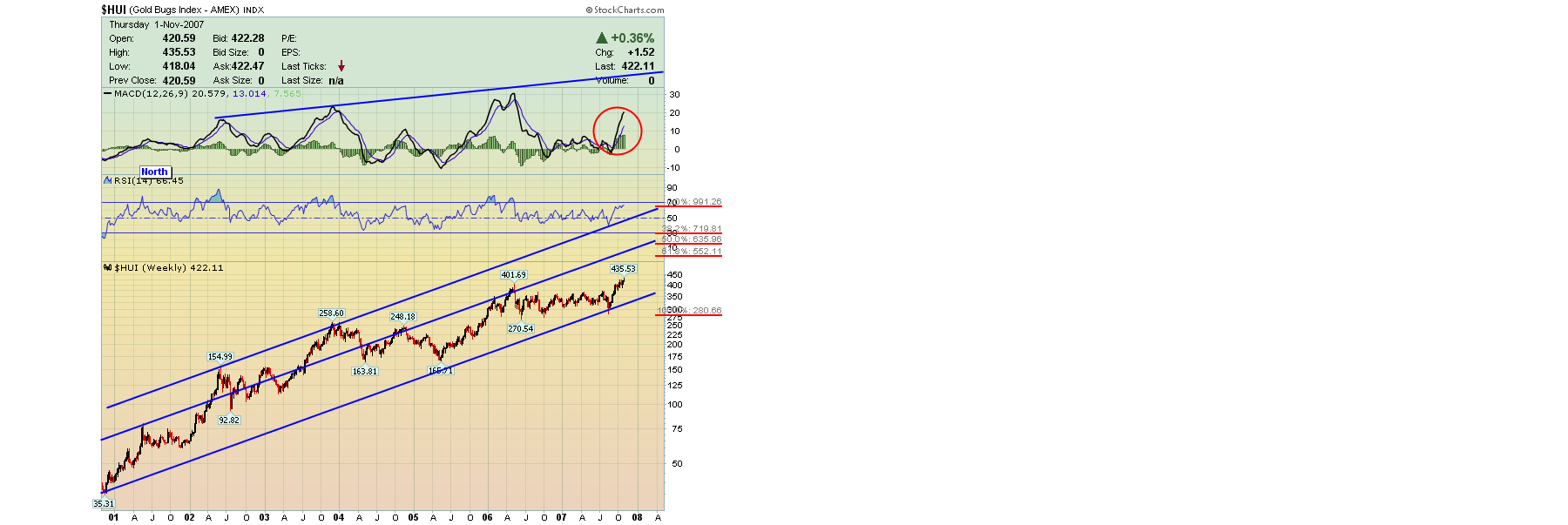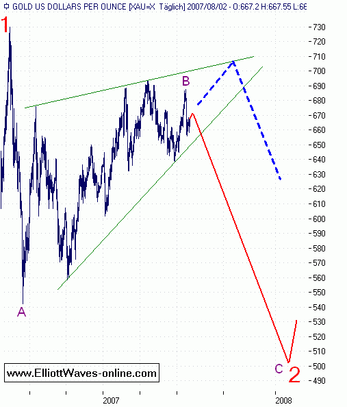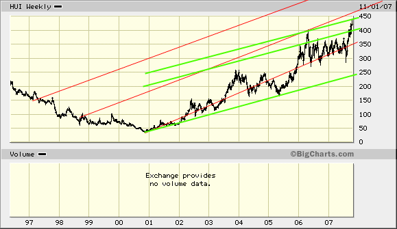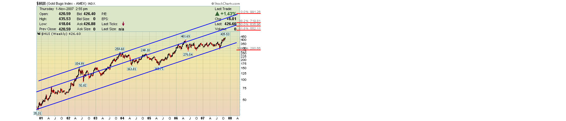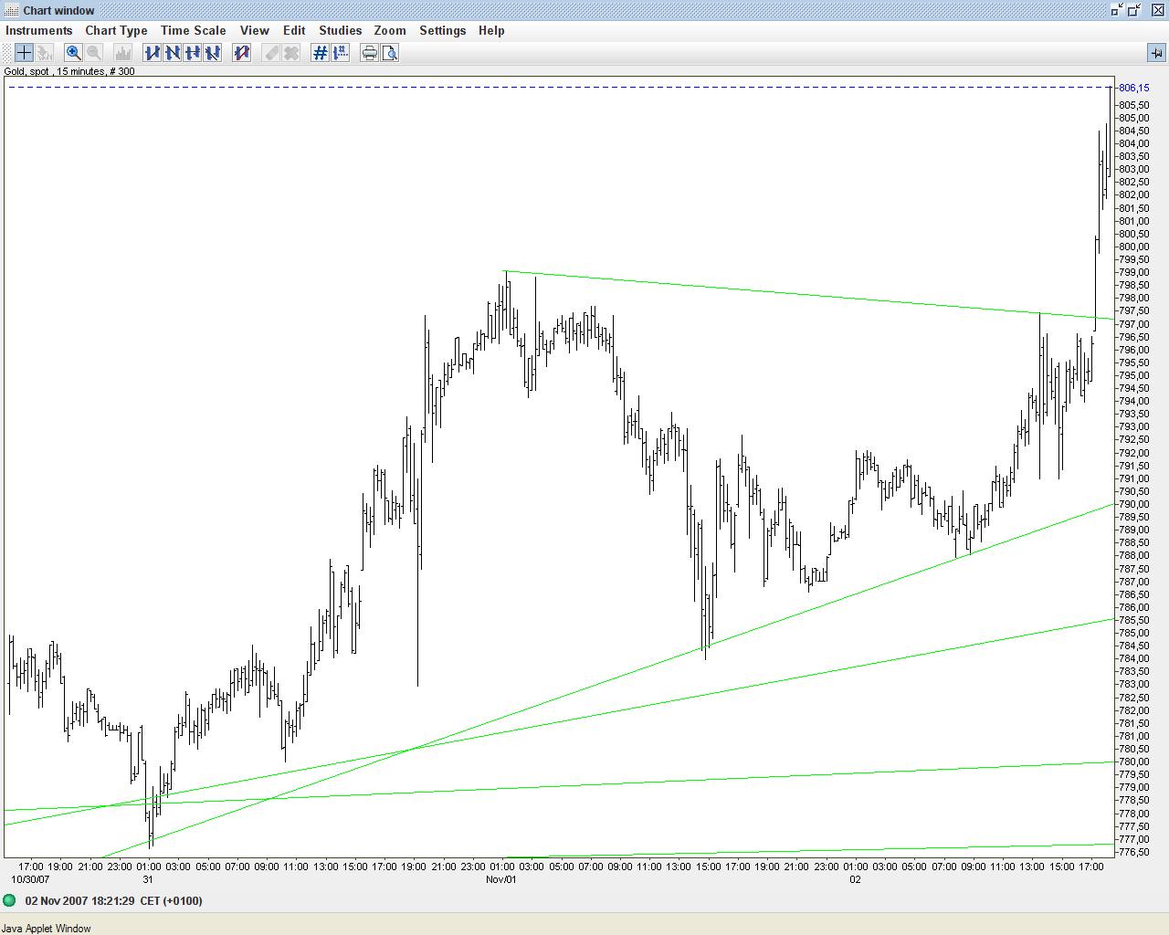 Bei netdania wird auf dem monthly und weekly chart XAUUSD, nicht spot-gold, ein Spike am 13.8.07 auf 499 angezeigt! Sieht nett aus. Solche Spikes können manchmal was signalisieren, zB als 03 der HUI mit den 140 kämpfte, war da so plötzlich ein spike auf 186. Sah wahnsinnig unrealistisch aus...