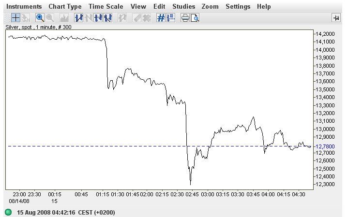 => Schablonski: Netdania behauptet, das Tief sei bei 12,29$ gewesen. Wo kommen Deine 12,12$ her? Vielleicht braucht man die Zahl mal für Debatten oder vielleicht wird sie sogar für Zwangsknockouts bei Zertis vor Gericht noch relevant. [sind Drückungen unter die SLs nachts um 2 außerhalb der Handelszeiten für Knockouts eigentlich relevant?]Morgen tauschen sicher viele Silberzehner ohne Wertverlust zurück in Fiat und dann unmittelbar in physisches Ag, falls proaurum angesichts der dann beängstigenden Kundenschlange überhaupt öffnen sollte und noch Bestellungen annehmen sollte!