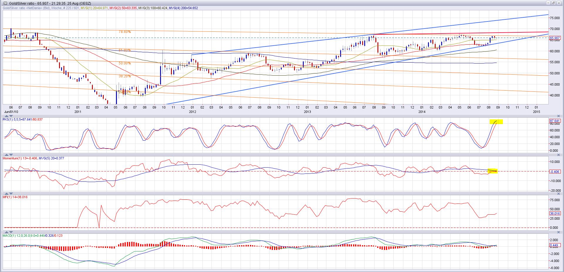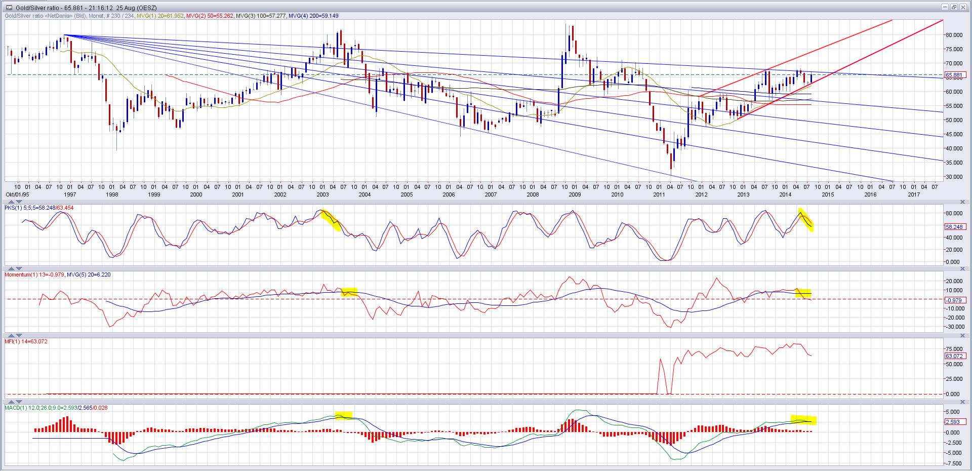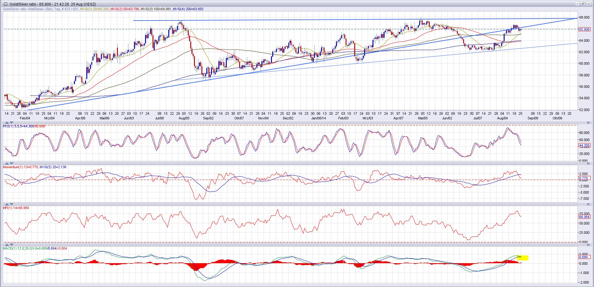 Nebst Silber, analysiere ich auch oft das Gold/Silber-Ratio. Dieses steht aktuell bei 65.88. Um es kurz zu beschreiben. Bei einem steigenden Goldpreis und einem gleichzeitig fallenden Gold/Silber-Ratio, würde Silber enorm profitieren. Beispiel: Der aktuelle Goldpreis notiert derzeit bei $1277.70. Wenn man diesen nun durch das aktuelle Ratio von 65.88 teilt, erhält man exakt $19.39, was genau dem jetzigen Silberpreis entspricht. Würde Gold nun also auf $1400 steigen und das Ratio auf 50 fallen, hätten wir einen Silberpreis von $28.-. Das klingt ja schon mal sehr gut. Nun schauen wir uns kurz mal die Charts des Ratios an.