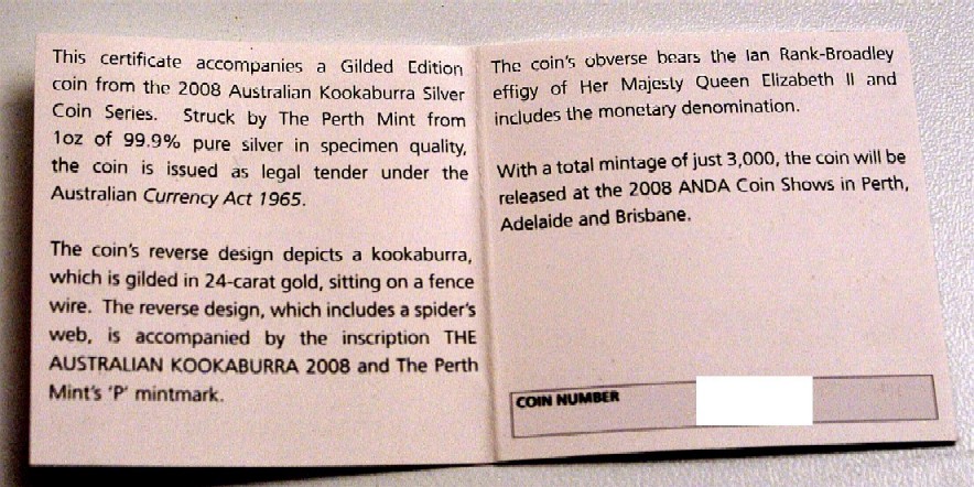 The Perth Mint has struck 3,000 ANDA 2008 gilded Kookaburra coins complete with COA.