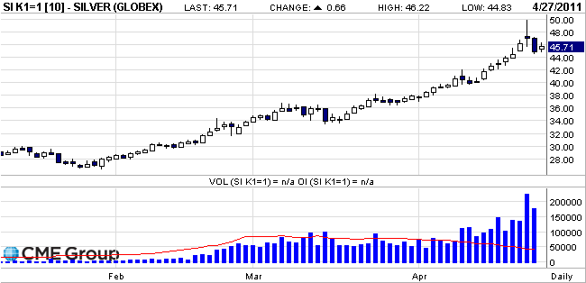 „2.) Die Serie von Margin-Erhöhungen durch die CME Group steigerte zusätzlich den Druck auf einen Markt, der ohnehin schon abwärts rollte. Die Erhöhungen der Margins beweisen im besten Fall, dass diese zuvor beim Silber zu niedrig angesetzt waren, dass die CME inkompetent und nachlässig bei der Festlegung der Margins war und dass man ihr diese Befugnis entziehen sollte. Im schlimmsten Fall beweisen sie, dass die CME die Erhöhung der Silber-Margins zeitlich so legte, dass sie ihren wichtigsten Mitgliedern bei der Verursachung des Silber-Crashs tatkräftig zur Seite stehen konnte.