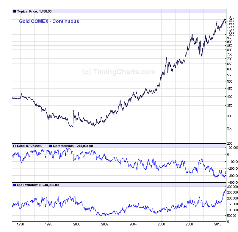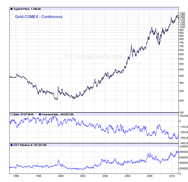 Was die untere Linie der reinen Longpositionen sagt ist denke ich auch klar. Die longs steigen ab März April 2010 von ca. 150.000 Kontrakten auf fast 300.000 Kontrakte. Kurzfristig wie oben beschrieben erfolgt eine Reduzierung sowohl bei den longs als auch bei en shorts.
