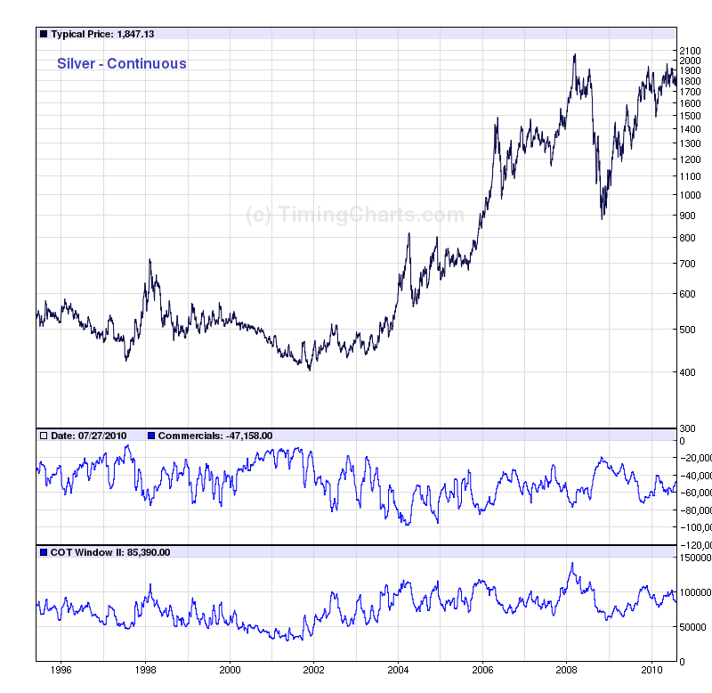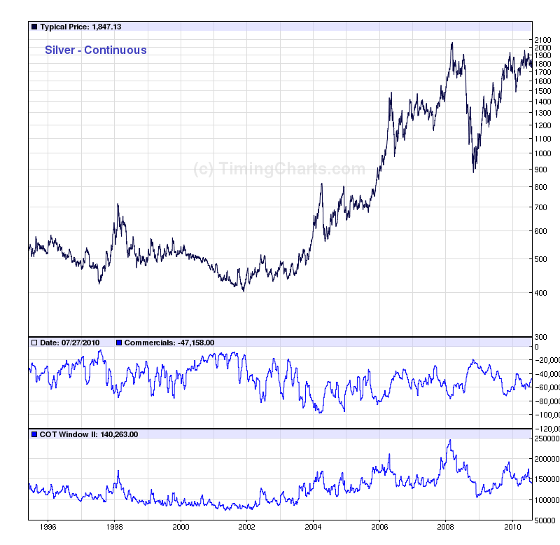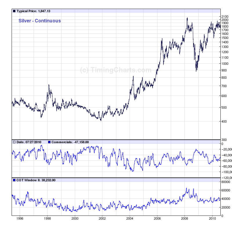 Die fallende Linie bedeutet, die comms bauen Nettoshort auf. Im Zuge des Aufwärtstrends beginnend ab Dezember 2008 stiegen die Nettoshorts von ca. 100.000 Kontrakten auf über 300.000 Kontrakte.