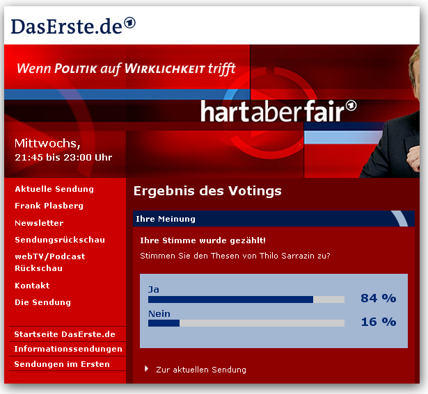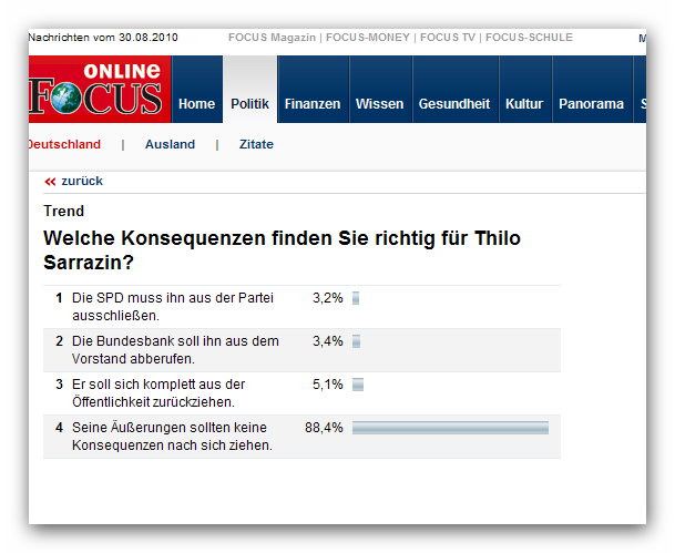 Das sehe ich anders, Milly. Bankenskandal und Landowsky sind hier die Assoziationen. S. war da zwar im Amt, aber seine Möglichkeiten bei Partymeister waren bekanntlich begrenzt. Mag auch sein, daß er so seinen eigenen Dreck am Stecken hat.... aber immerhin wagt er es, die Tabuzonen zu betreten, und "vox populi" zu reden. Selten genug. Ich hab nicht über Sarrazin zu urteilen.... ich kenne ihn nur aus den Darstellungen der MSM. Aber über das was er sagt/schreibt kann ich urteilen, weil ich offenen Auges durch die Welt laufe. Der Mann hat nun einfach mal recht....