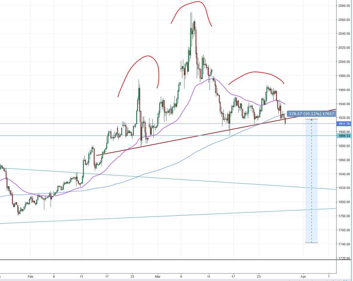 Um doch noch zu Gold zu kommen. Schaut mal auf 4 H Chart, könnte sein das wir ne hässliche SKS ausbilden, wenn wir unter die leicht schräg nach oben laufende Nackenlinie bei ca. 1910-15 USD (nicht pingelig sein) fallen - heisst es Obacht. Für Chart bin ich heute mal zu faul, ist nicht mehr mein Tag (Typos bitte ignorieren...)