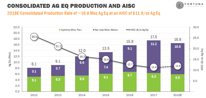 Schön ist die Kostenentwicklung per Unze Silber über die letzten Jahre, wie man sie der Dezemberpräsentation entnehmen kann.Auch wenn die AISC 2018 leicht auf 11,9 $ angestiegen sind, für einen bisher noch fast reinen Silberproduzenten sind das starke Zahlen. Das wird voraussichtlich reichen, damit Fortuna irgendwann im weiten Quartal schuldenfrei ist.