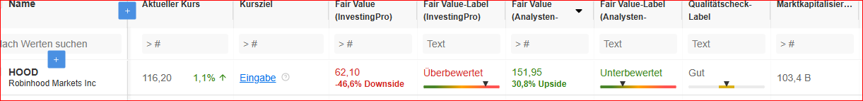 Im Chart verkleiden sich halt bisweilen Fundamentals und Zukunftserwartungen, jedoch nach den Regln der Charttechnik. Auf investing.com pro wird mir UUUU als fair bewertet angezeigt.
