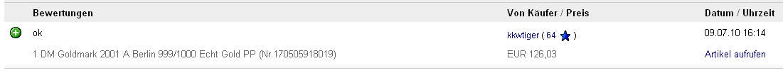 Der Verkäufer hat die wiedereingestellte "Goldmark" nun für 126,03 EUR verkauft und heute eine positive Bewertung erhalten.