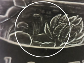 Schwieriger wird es mit Foto 2. Es zeigt die Stelle unterhalb/seitwärts der rechten Hinterhufe im Gestrüpp. Dort war in den Jahren 2017 und 2018 sowie im letzten Jahr 2021 ein weiteres Sicherheitsmerkmal. Gemeint ist der Schriftzug bzw. Hinweis auf die South African Reserve Bank. “SARB“ bzw. in 2021 “V SARB21“).In den Jahren 2019 und 2020 fehlte der Hinweis auf die South African Reserve Bank. Es scheint, dass im neuen Jahrgang dieser Schriftzug wieder fehlt. Ich konnte diesen mit meinen technischen Möglichkeiten auf dem Krügerrand 2022 nicht ausmachen.