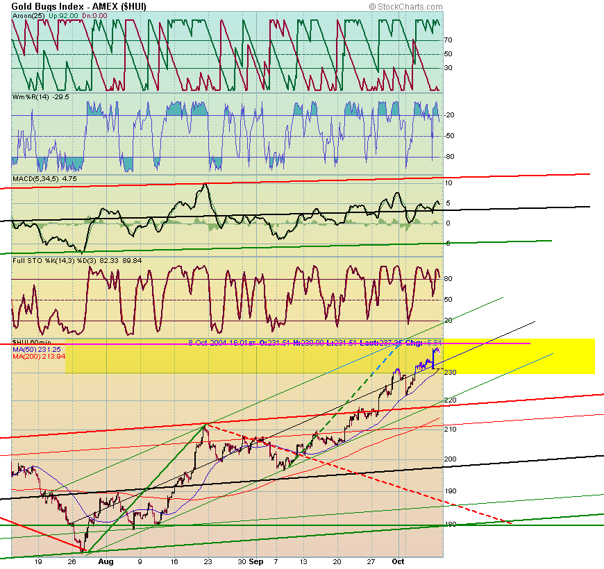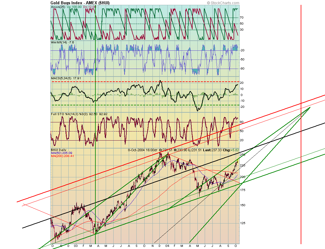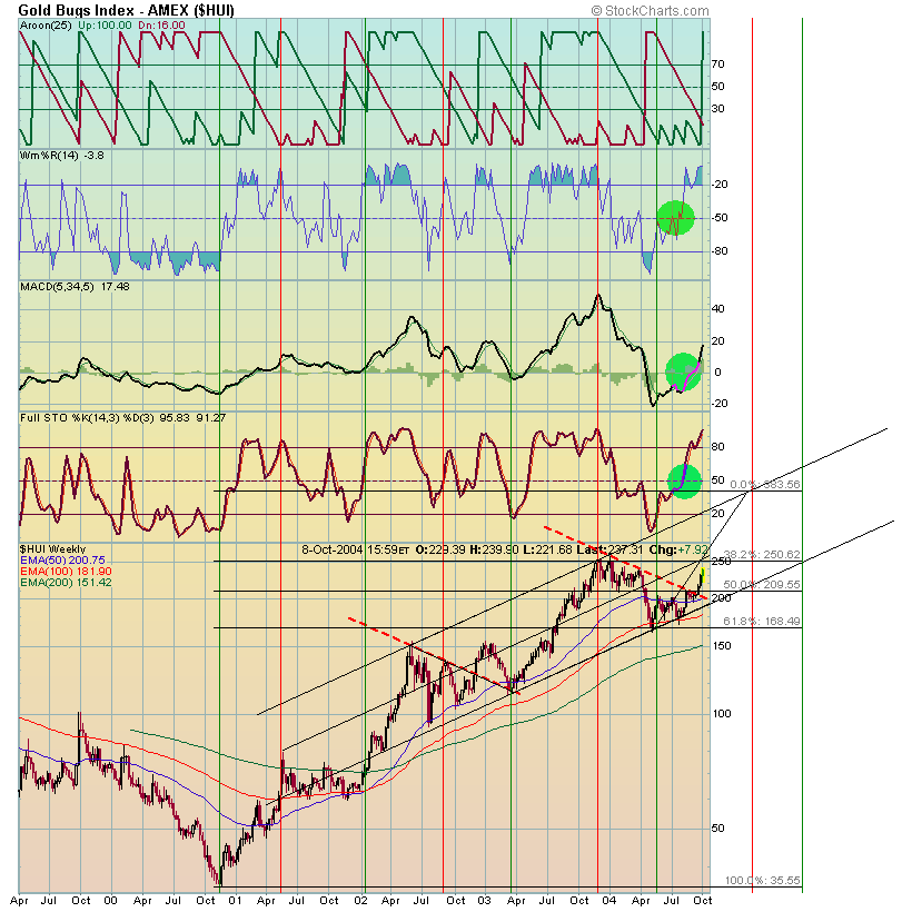 The gold producing companies, as viewed through the action of the HUI, struck their lows in May. I believe that they will join and make new highs along with gold. They have completed their bases and await a breakout to new high levels before they will really roar. The HUI is trading at 227.47 and its Bull Market peak is $258.60. Additionally, it's 50 day moving average just rose above its 200-day average. They are 208.38 and 207.23 respectively. Thus the HUI's moving average study has turned bullish, which is a major plus.