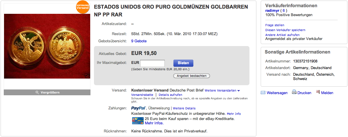 wäre, könnte man direkt drauf reinfallen. Falls diese Fälschungen tatsächlich im Umlauf sind, und der Händler nicht das Bild einer Original-Münze geklaut hat, dann hat sich jemand richtig Mühe gemacht. Auf jeden Fall deutlich besser als diese lachhaften Miniatur-"Gold"münzen, die aussehen wie gepresste und mit Goldbronze angemalte Aluminiumfolie.