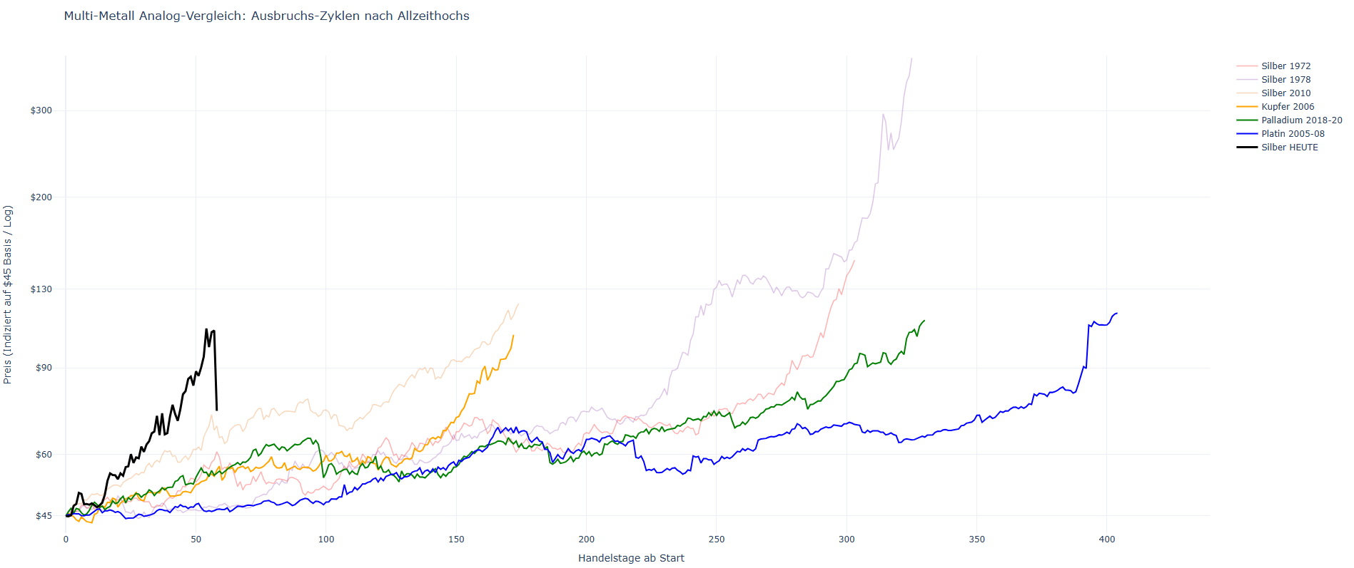 Zusätzlich mit rein genommen habe ich Platin und Palladium. Die Startpunkte sind sicher nicht exakt am Ausbruchsdatum, das kann schon mal um ein paar Tage variieren.....
