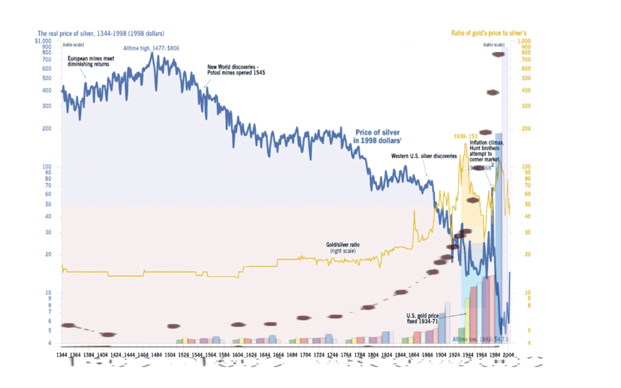 ZitatBliebe nur noch die Frage, wie relevant solche Wertverhältnisse im 14. Jhd für die heutige Zeit und für die Zukunft sind. Im 14. Jhd war vieles anders, nicht nur die Kaufkraft von Silber......Woher kommt das Naturgesetz, dass die Kaufkraft einer Unze Silber wieder das gleiche Niveau erreichen muss?