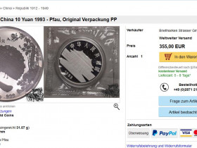 Deswegen sollte man gut abwägen was man kauft.Nicht jeder Käufer denkt beim Kauf schon wieder an den Wiederverkaufswert. Wenn man Geld verdienen möchte muss man keine Chinamünzen kaufen, dafür gibt es einen Aktienmarkt, an dem man in den letzten Jahren viel Geld ohne besondere Anstrengungen verdienen konnte. Alle meine Chinamünzen sind daher "geschenkt" und nur für den Spass