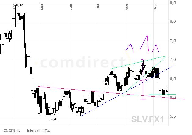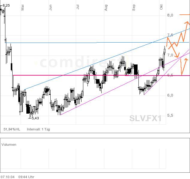 Wie ich das sehe, fehlt nun der Retest des roten Aufwärtstrends. Fallen wir unter den zurück, wäre es nicht so gut! Geht die Reise nach oben, wäre das nächste Ziel ca. 7,25. -