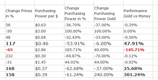 Wichtig sind die Spalten 3 und 4, die die Kaufkraftveränderungen von Gold und Dollar im Zeitraum angeben.