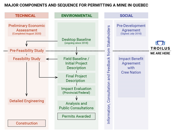 Auf Bundesebene markiert die Einreichung der ersten Projektmitteilung den Beginn der "Planungsphase", in der die IAAC die Öffentlichkeit und die indigenen Völker auffordern wird, sich zu den Schwerpunkten und Prioritäten der ESIA zu äußern und zur Planung beizutragen. Die Planungsphase wird voraussichtlich 180 Tage in Anspruch nehmen und zu einer Reihe von Leitlinien führen, die Troilus bei der Vorbereitung der ESIA befolgen wird. Auf Provinzebene wird das MELCC die ursprüngliche Projektankündigung an das Comité d'évaluation des répercussions sur l'environnement et le milieu social ("COMEV") weiterleiten, um die Auswirkungen des Projekts zu bewerten und Leitlinien für die ESIA zu erstellen, die innerhalb von 30 Tagen erwartet werden. Da die Genehmigung sowohl auf Bundes- als auch auf Provinzebene erforderlich ist, wird Troilus im Wesentlichen ein paralleles Bewertungsverfahren durchführen, das in zwei ESIA-Berichten resultieren wird, um den Bedenken und Prioritäten auf beiden Regierungsebenen Rechnung zu tragen.
