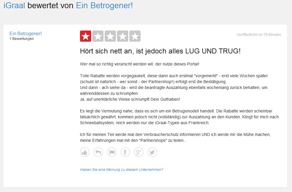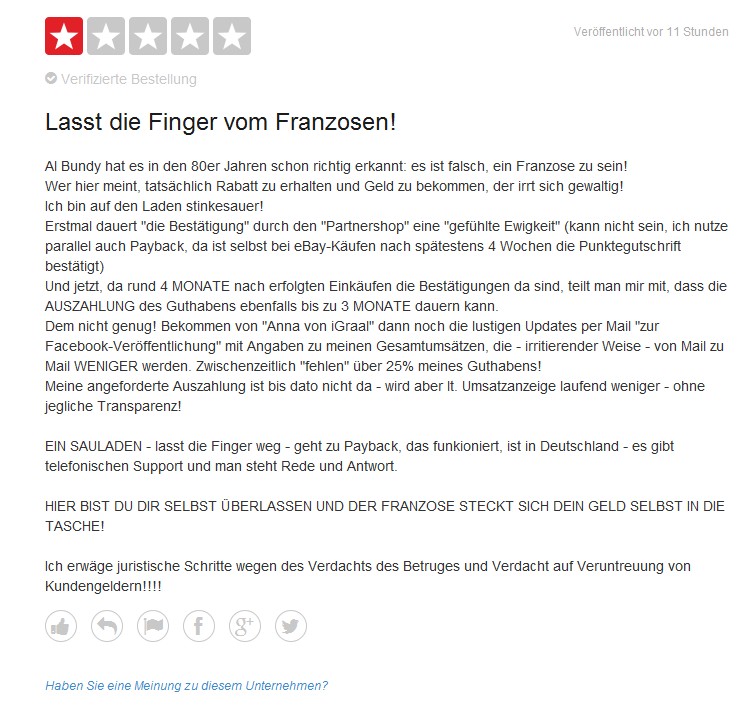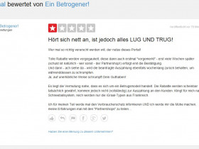 https://de.trustpilot.com/revi…/56d53a800000ff000940c0ecbin ja gespannt, wie lange es dauert, bis sich die Bewertung wie das cashback in Luft aufgelöst hat