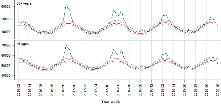 EuroMOMO hat alle Gestorbenen bis Woche 10 (bis 8. März) aufbereitet. Verdikt: all-cause mortality show normal expected levels of mortality.