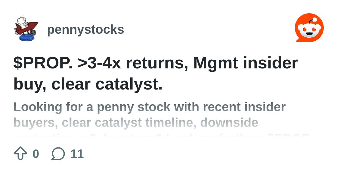 Ich werde hier auch den Exit machen. Im Investor Call hatte ich keinen guten Eindruck vom CFO. Daher dem Bauchgefühl vertrauen und raus. Ich überlege jetzt spekulativ bei $PROP zu erhöhen u.a. wegen der kürzlich getätigten massiven Zukäufe des Großaktionärs Gregory O'Neill.