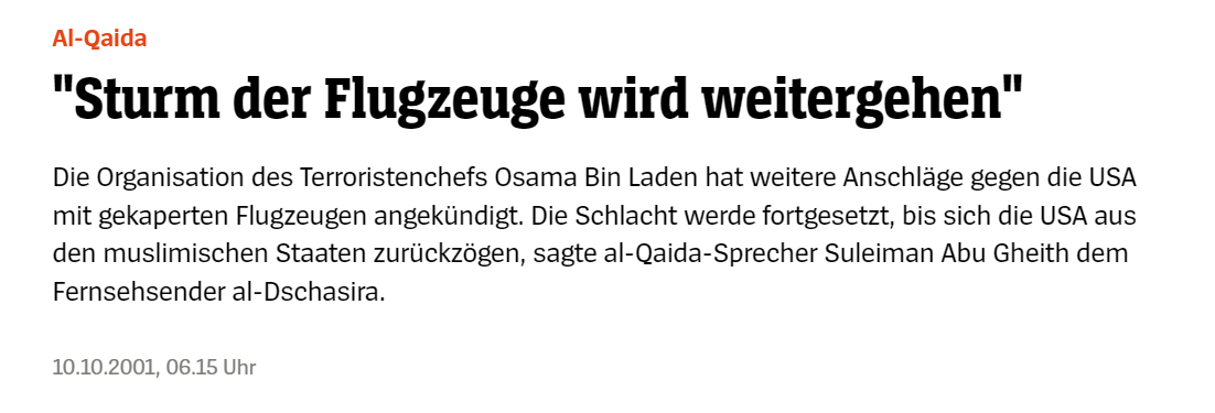 Diese Aussage erinnert mich seht stark an 2001 und die Drohung "Der Sturm der Flugzeuge wird weitergehen".