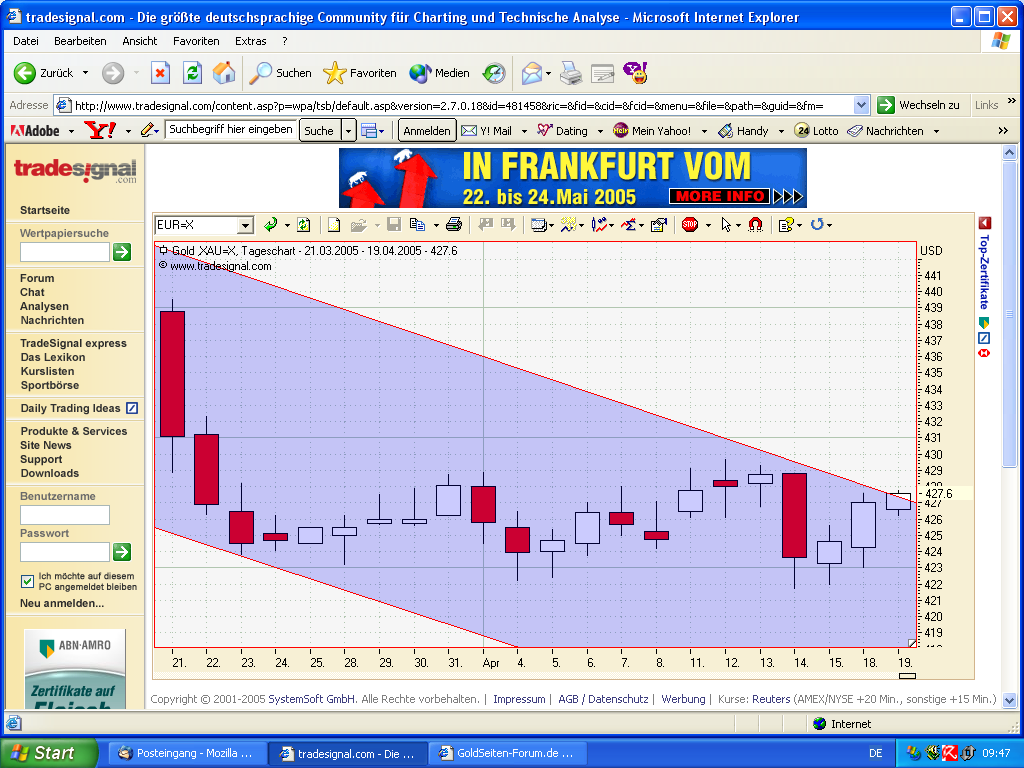 heute war ein sehr guter tag für gold deshalb sollte man morgen seine gewinne zusammen raffen und dem markt tschüss sagen den sobald er unter 430 schließt wars das mit der bewegung richtung norden.