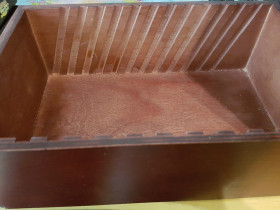 2 x flache Boxen in Holzoptik. Jede Box hat einen fest installierten Einleger mit 16 Abteilungen, wobei jede Abteilung 4,5 cm x 4,5 cm groß ist.