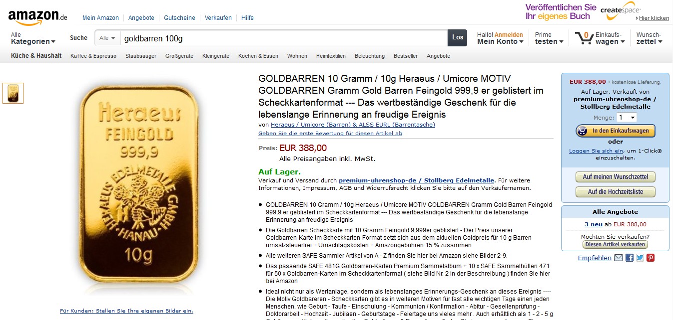 ich habe immer mal wieder bei Amazon nach Edelmetall geguckt. Bisher habe ich immer nur diese fake Barren gesehen, die man sich ins Wohnzimmer oder Schaufenster stellen kann. Jetzt haben wir schon die ersten "echten" Händler, die es über einen Amazon-Shop probieren. Unter anderem Stollberg Edelmetalle, siehe screenshot.