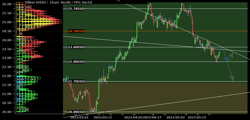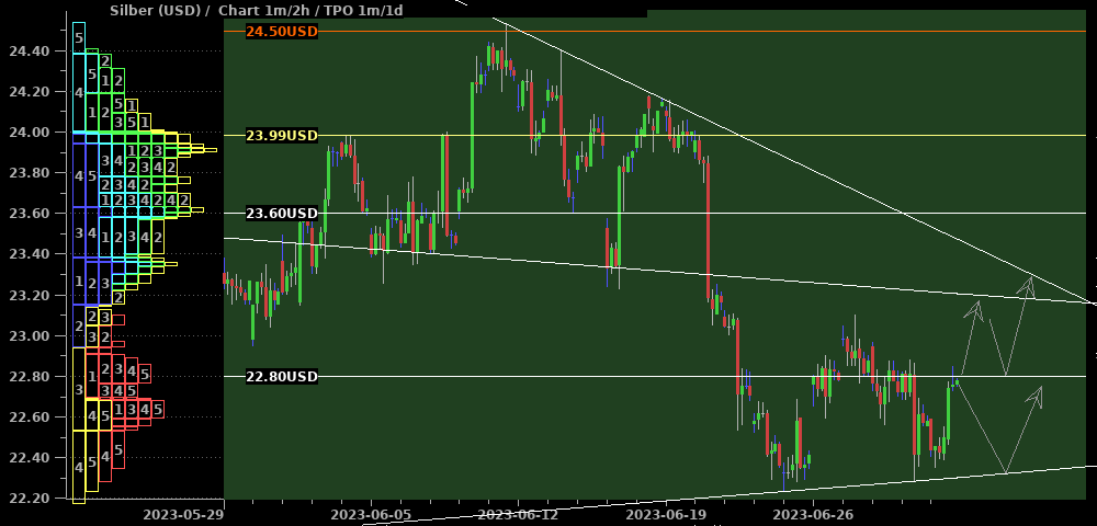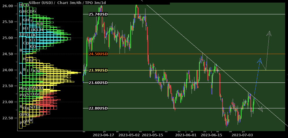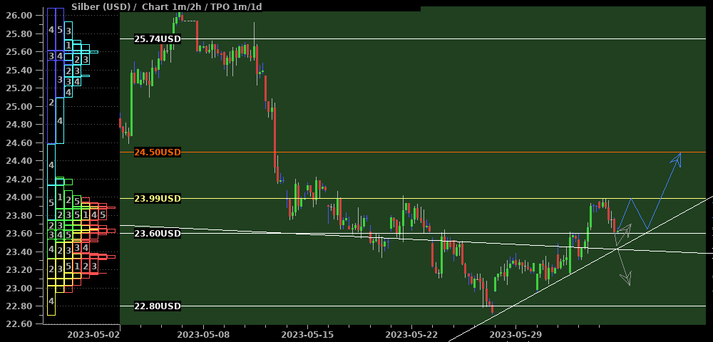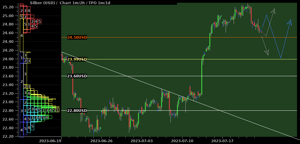 Silber war am Do/Fr echt nicht schön mitzuerleben, aber im 1-Monatschart sieht man, daß eigentlich noch nicht viel passiert ist. Insbesondere hat die Unterstützung bei $24,50 gehalten. Ich sehe eine 60%ige Wahrscheinlichkeit dafür, daß die $24,00 noch einmal angelaufen wird, um die in den letzten Tagen Zugestiegenen herauszuschütteln, und eine 40%ige Wahrscheinlichkeit, daß es bereits ab der $24,50 wieder nach oben dreht.