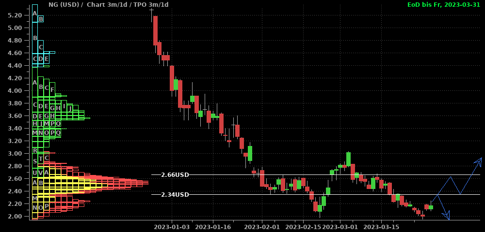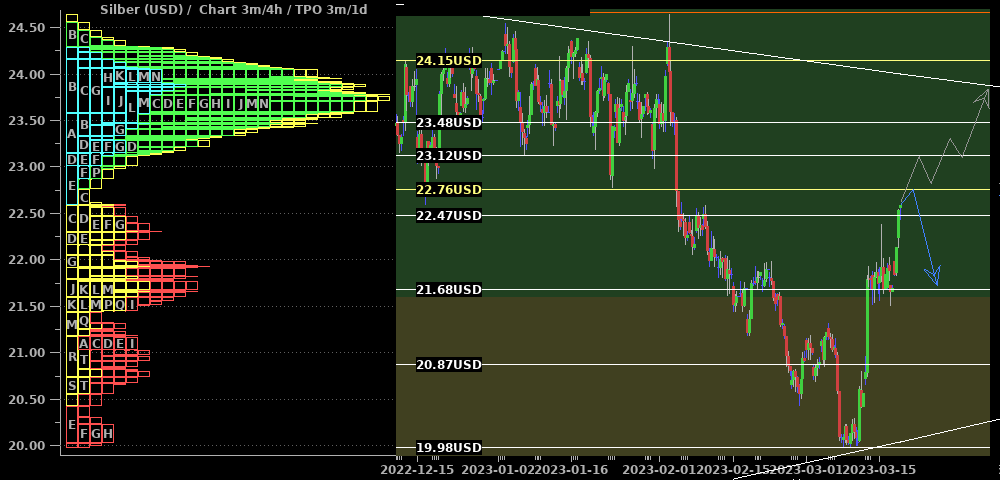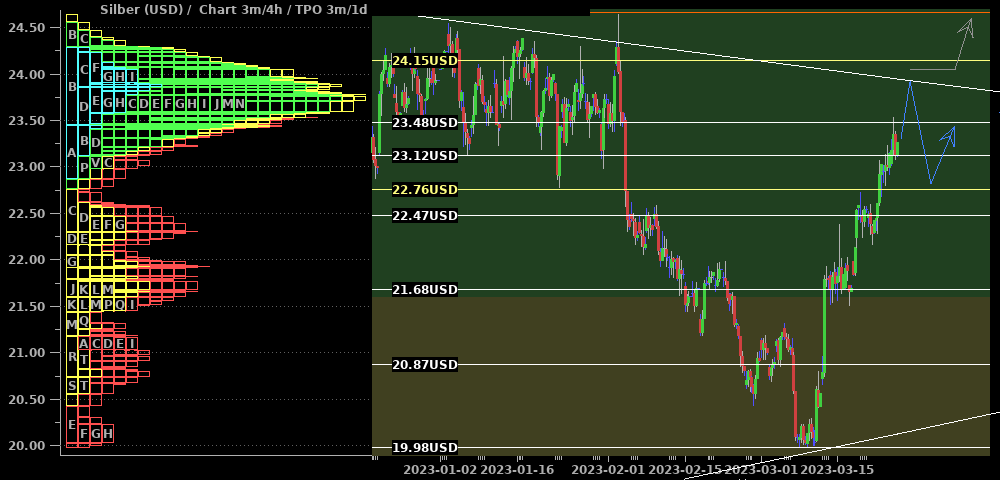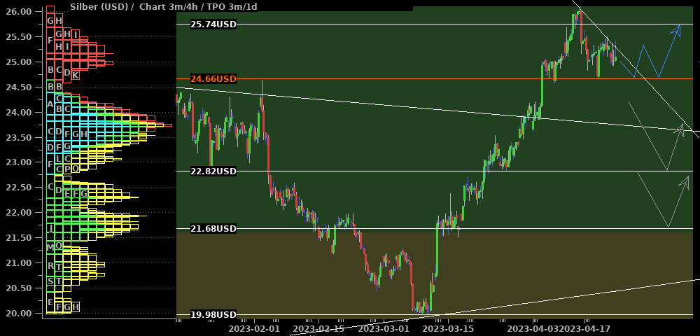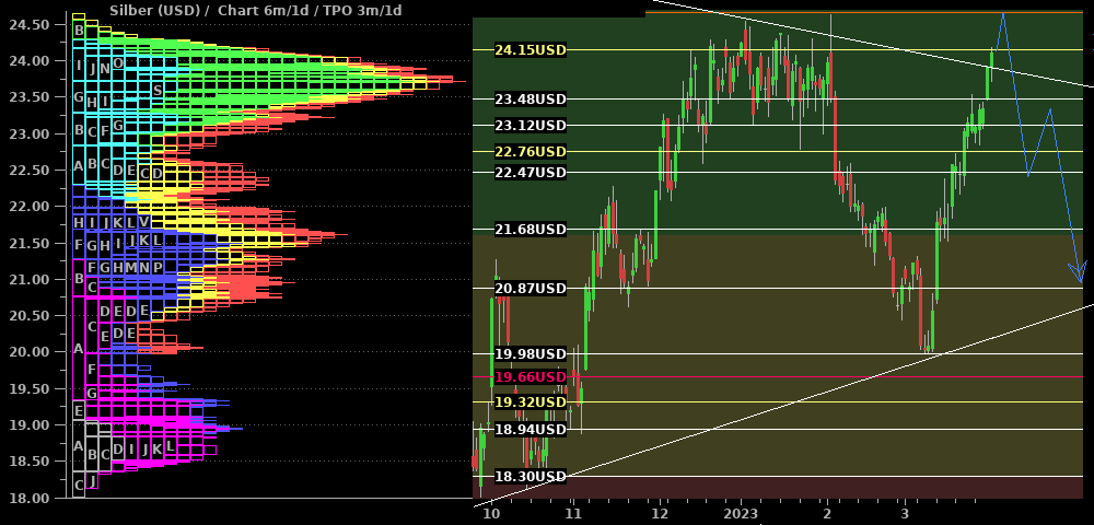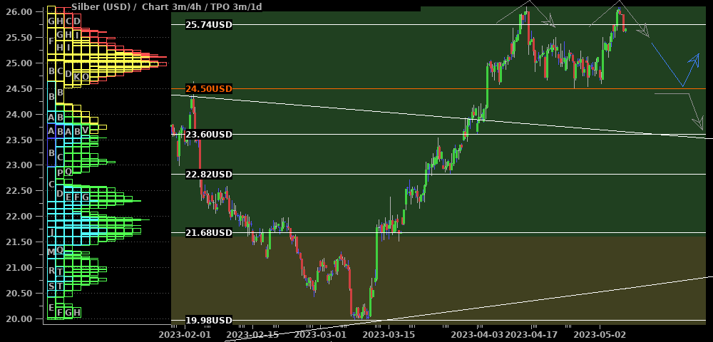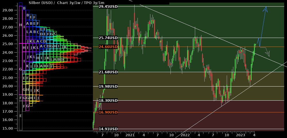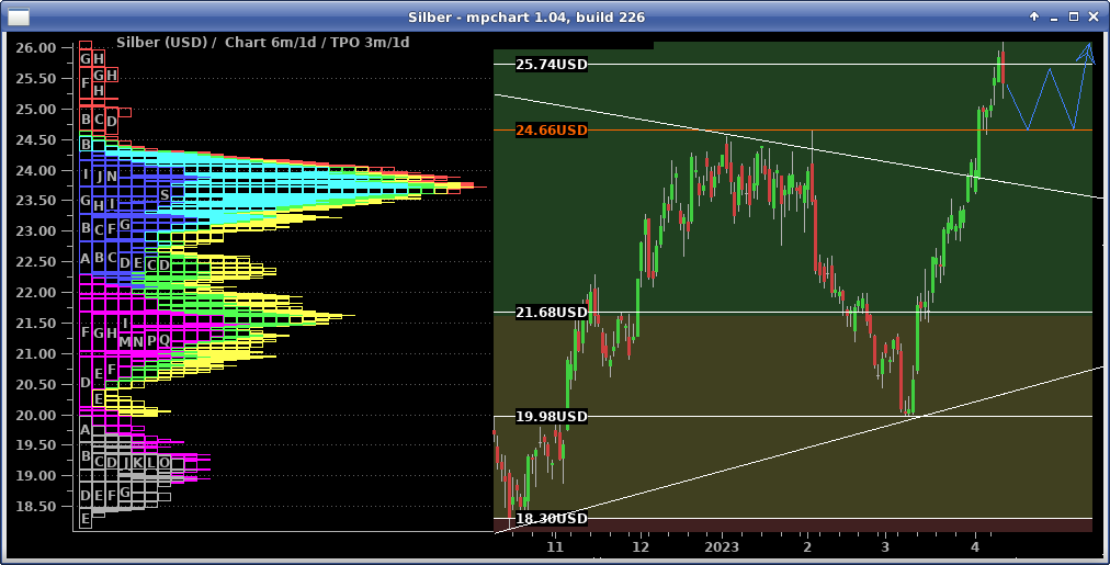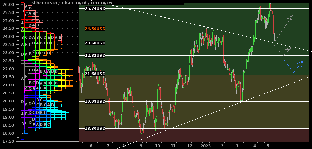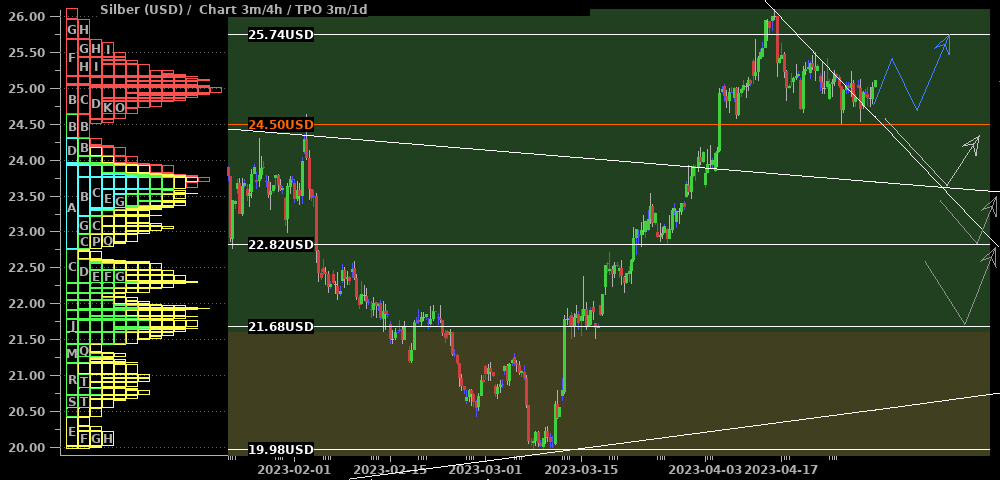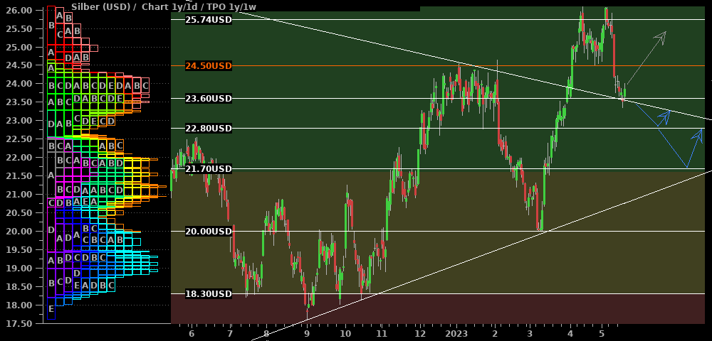 Beim Silber haben die Marken aus der letzten Woche Bestand, nun jeweils auf glatte 10c gerundet. Positiv zu sehen ist, daß die $23,60 gehalten wurde. Das kann aber auch nur eine Reaktion auf die vorhergehende Abwärtsbewegung gewesen sein. Die Saisonalität der kommenden Monate ist eher schwierig, und die momentane Dominanz der Standardwerte ist auch nicht hilfreich. Daher richte ich mich eher darauf ein, daß die unteren Pfade noch erreicht werden.