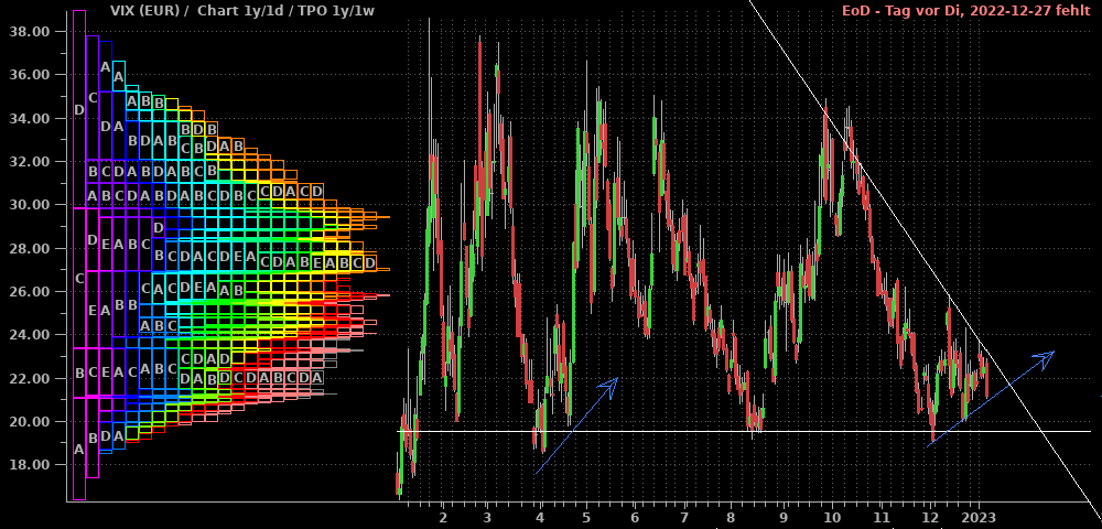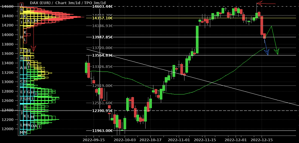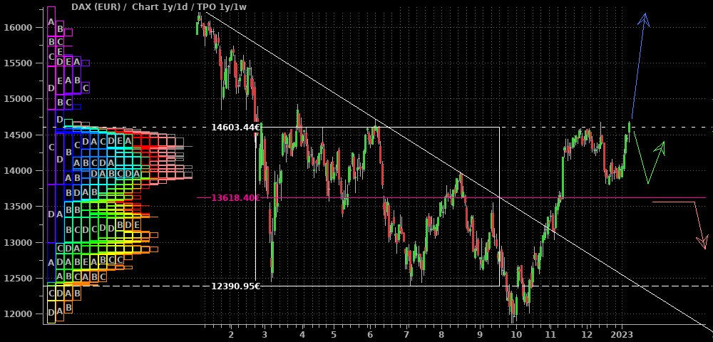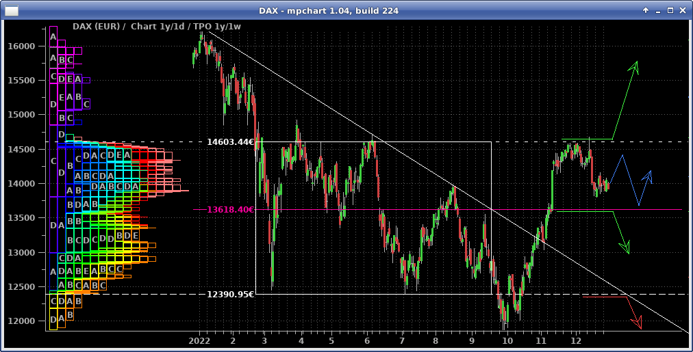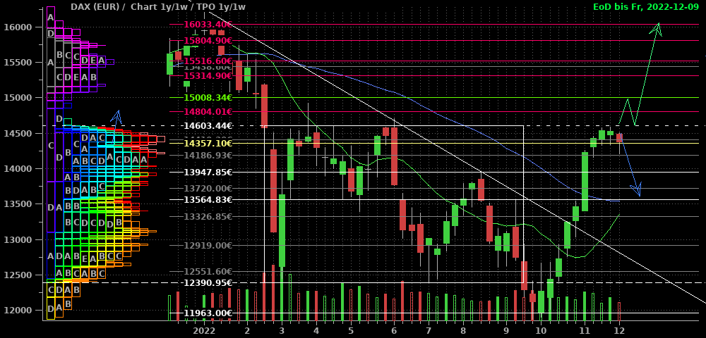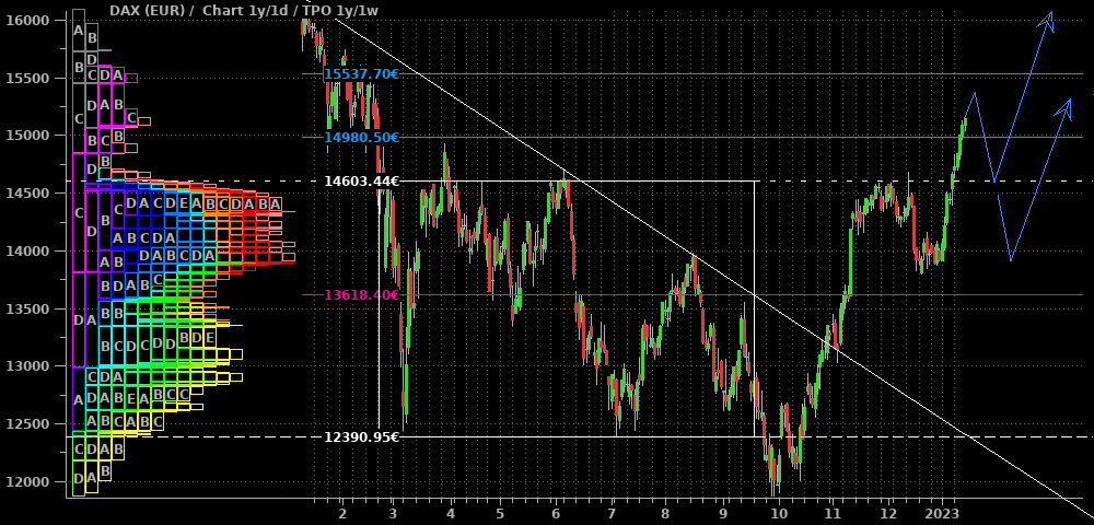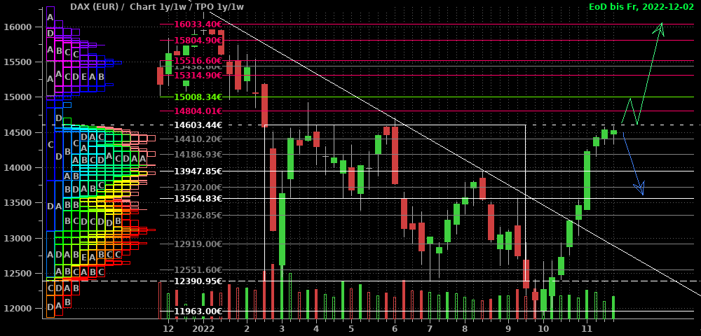 Im DAX war in der abgelaufenen Woche komplett tote Hose, wie man im 2h-Chart sieht. Wenn es blöd für die Shorts läuft, schleicht er sich über 15.270 nach oben heraus (blauer Pfad) und löst die nächsten Stops und damit eine Squeeze zum Allzeithoch aus. Für eine ernstzunehmende Korrekturfortsetzung müßte nun dringend eine Bewegung mit Tagesschluß unter den Start des blauen Pfeils bei 14.900 kommen. Berücksichtigt man die wiedererstarkenden Märkte in den USA, so erscheint mir der Weg nach oben als wahrscheinlicher.