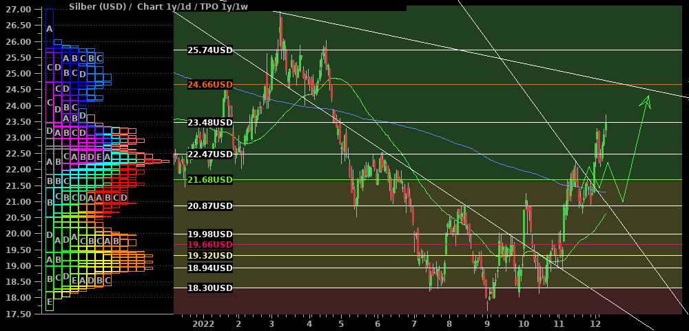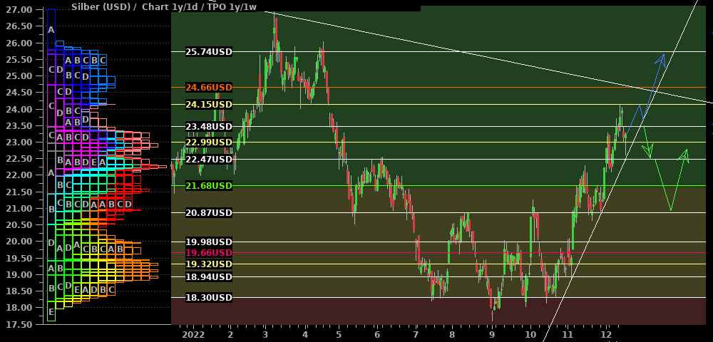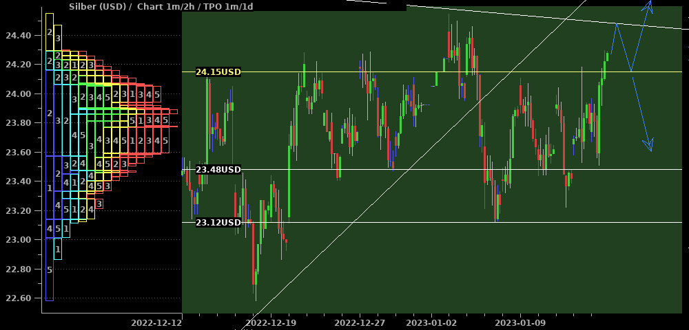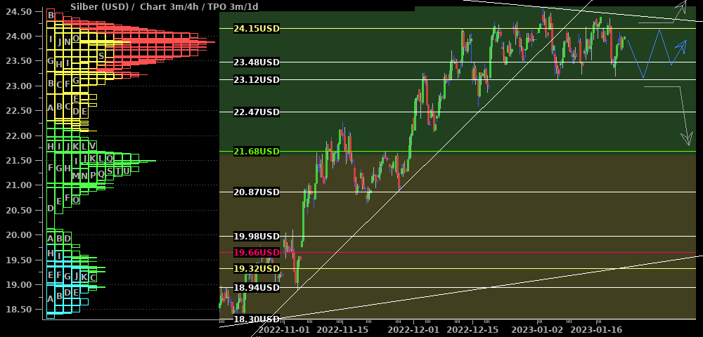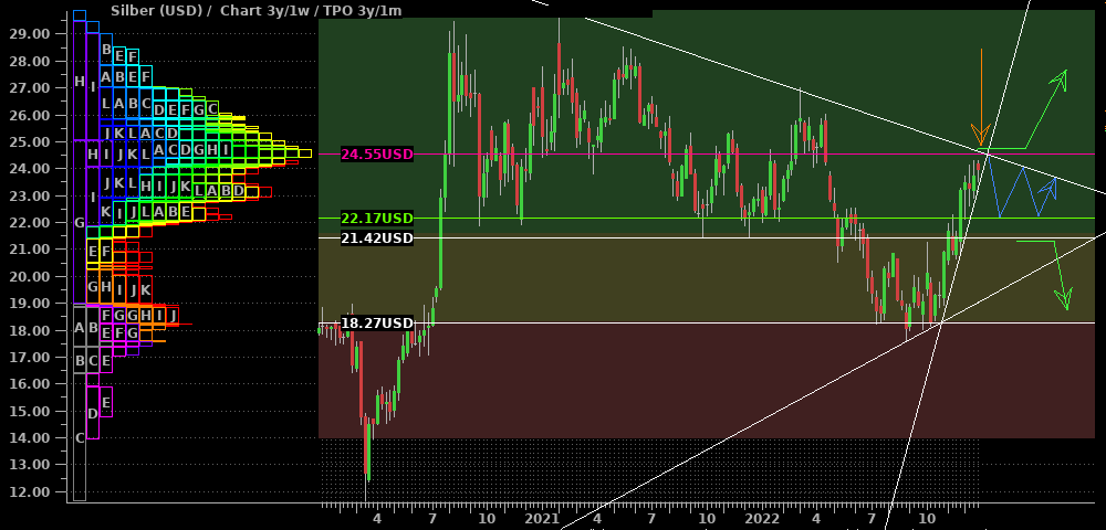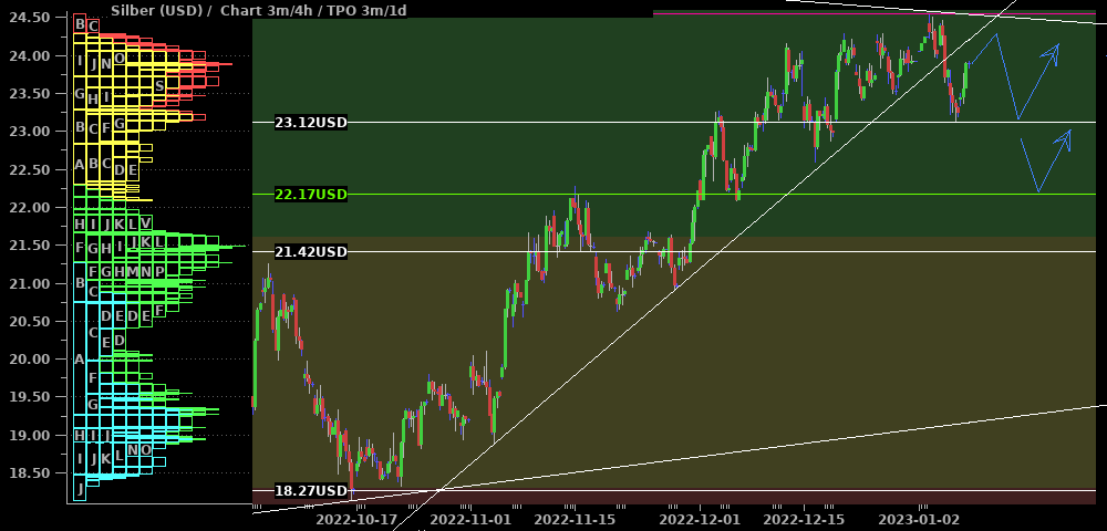 Silber setzte das in der letzten Woche präferierte Seitwärtsszenario fort. Die ausgebildeten Hochs nehmen zur Zeit ab (roter Pfeil) und dies parallel zu einem seit 2021 bestehenden Abwärtstrend. Zudem sieht auch Gold kurzfristig ausgereizt aus. Deshalb erwarte ich weiterhin eine Ausdehnung der Konsolidierung nach unten und über die Zeit (blauer Pfeil), bis der Markt genug Kraft zum Ausbruch gesammelt hat. Zuviel Potential nach unten erwarte ich allerdings auch nicht und werde voraussichtlich bei $22,50 bereits mit long-Trades beginnen.