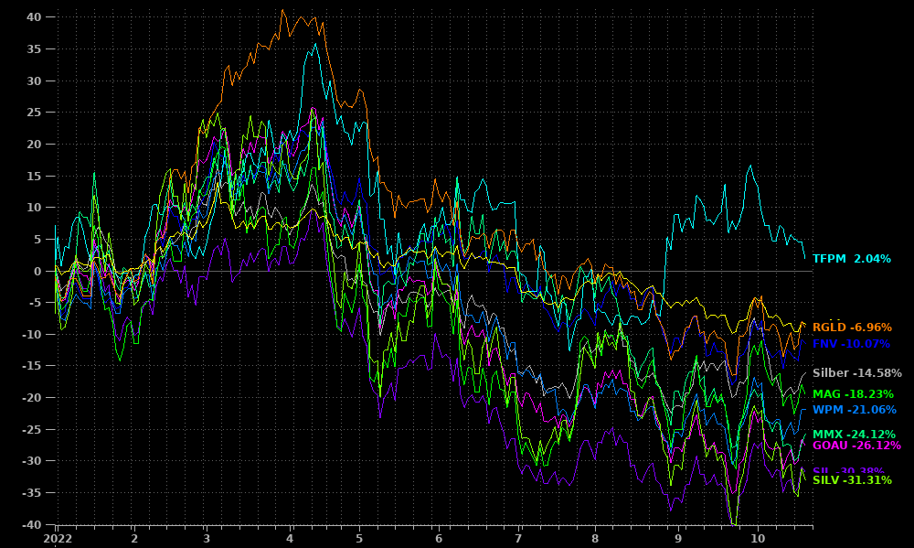 Silberwerte: MAG +2,44%, SILV -3,20%, RGLD +1,42%, TFPM -3,15%, WPM +2,14%