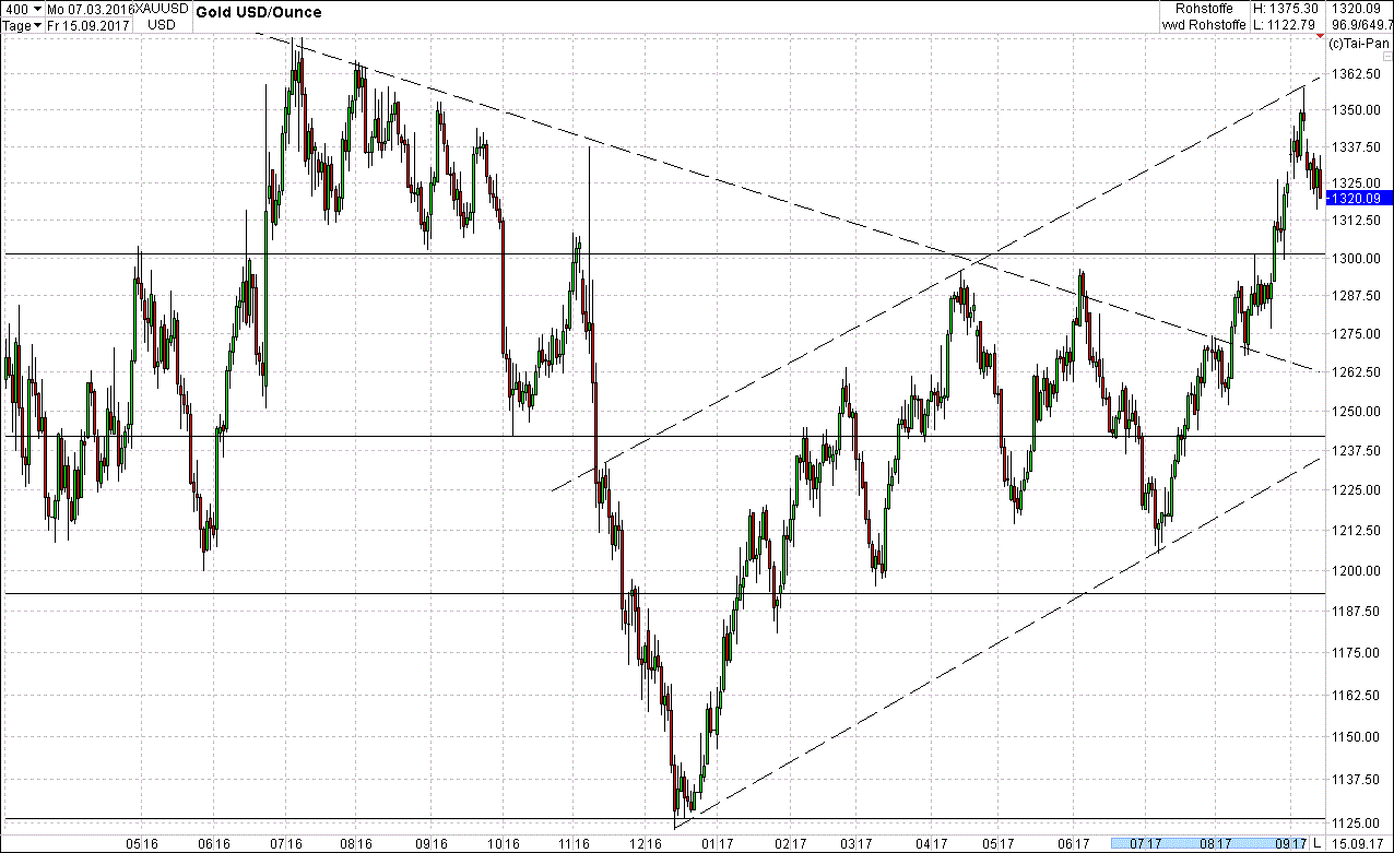 b) Gold pendelt monatelang um die 1.300.
