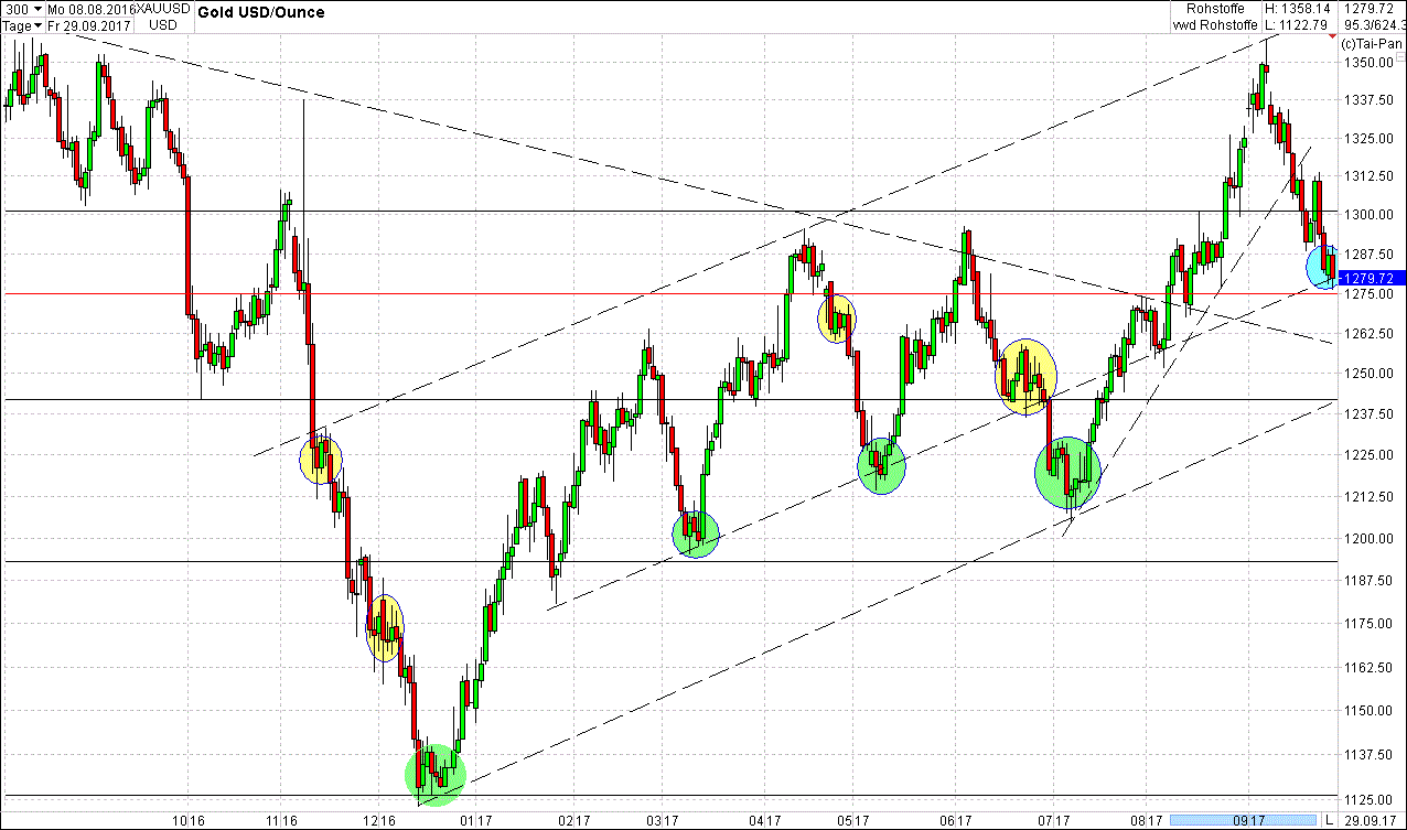 c) Gold korrigiert wesentlich tiefer als 1.250; danach nur Erholung auf 1.300.