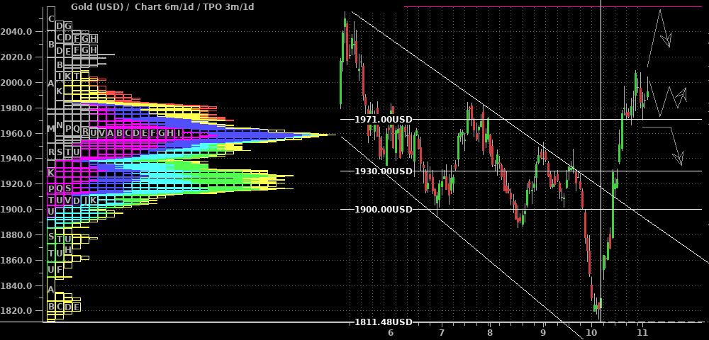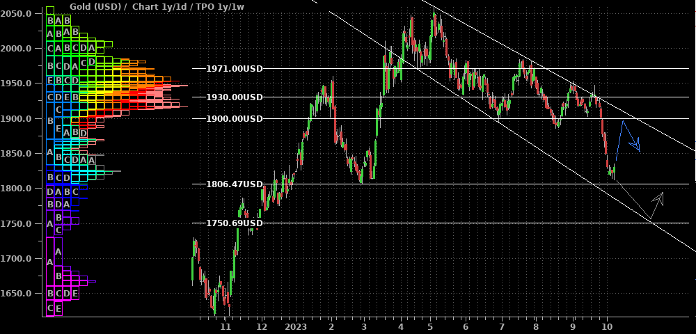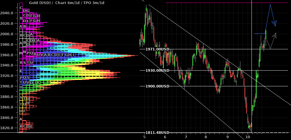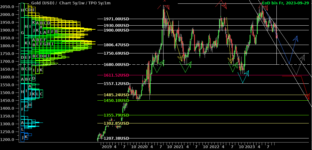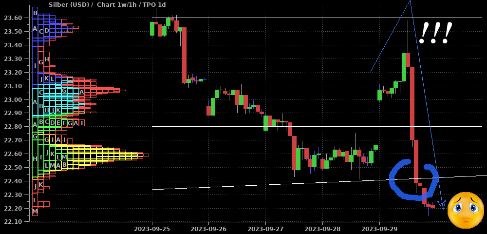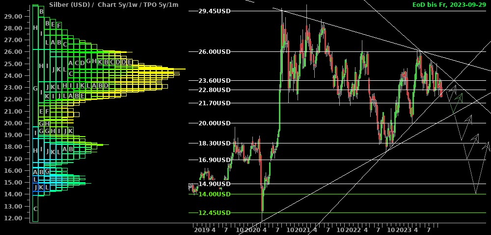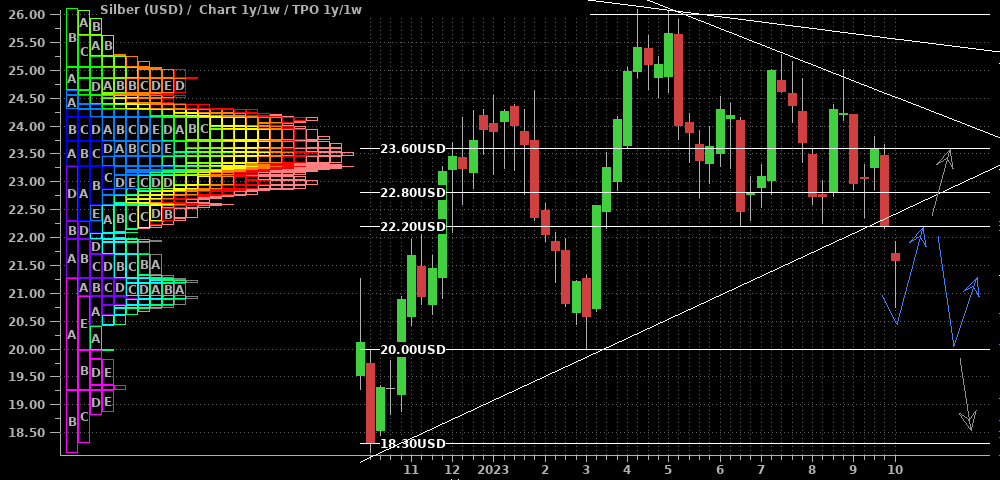 Silber schiebt sich seit dem Erreichen des Hochs vor zwei Wochen seitwärts zwischen $22,60 und $23,60. Aus der Performance einiger Produzenten und Royalties könnte man einen bullischen Ausbruch herleiten; ebenso wäre zusammen mit den Standardwerten nun ein erneutes "Alles steigt"-Szenario denkbar. Deshalb nehme ich den grünen Pfeil für ein kurzfristiges Umdenken mit in die Ideenskizze auf. Insgesamt ist mir das aber nach heutigem Stand zu wenig und ich bleibe an der Seitenlinie, bis die Situation klarer wird.