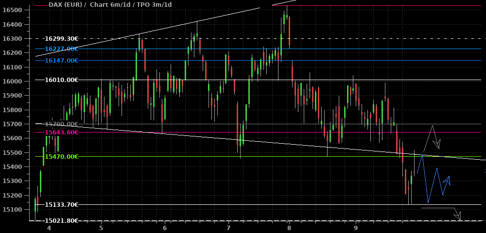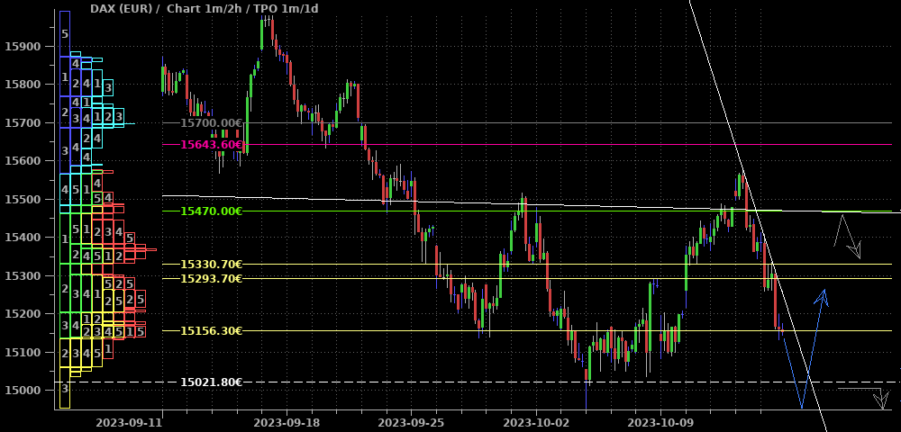 Der DAX ließ sich nicht lumpen und holte nicht nur die erwarteten 14.900 Punkte, sondern mehr als die doppelte Strecke nach oben. Damit hat er nun die Möglichkeit eröffnet, die positive Jahresende-Saisonalität zu nutzen und über den blauen Pfad aus dem Abwärtskanal herauszulaufen. Alternativ wäre ein weiteres Ausholen mit einem letzten Test der 14.600 und der unteren Kanalkante möglich. Ich habe mir die 15.000 und 14.600 als Marken für den Ausbau weiterer Longs vorgemerkt; die tieferen Marken aus der letzten Woche stelle ich zurück.