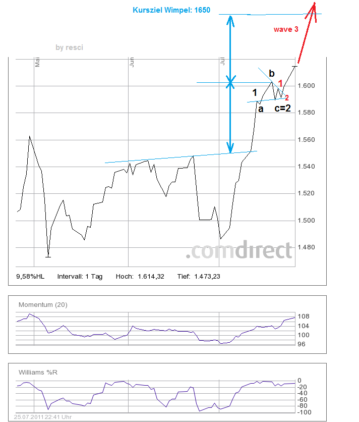 Welle 1 (schwarz) des ersten Pulses ist abgeschlossen, a-b-c Korrektur als überschießender Test ebenso. Darauf folgt eine Ausdehnung in der Welle 1 und 2 (rot) bereits abgeschlossen sind. Aktuell befinden wir uns in der dritten Welle die uns mindestens bis 1650 bringen sollte (Kursziel einer Wimpelformation), wahrscheinlich aber noch wesentlich höher.