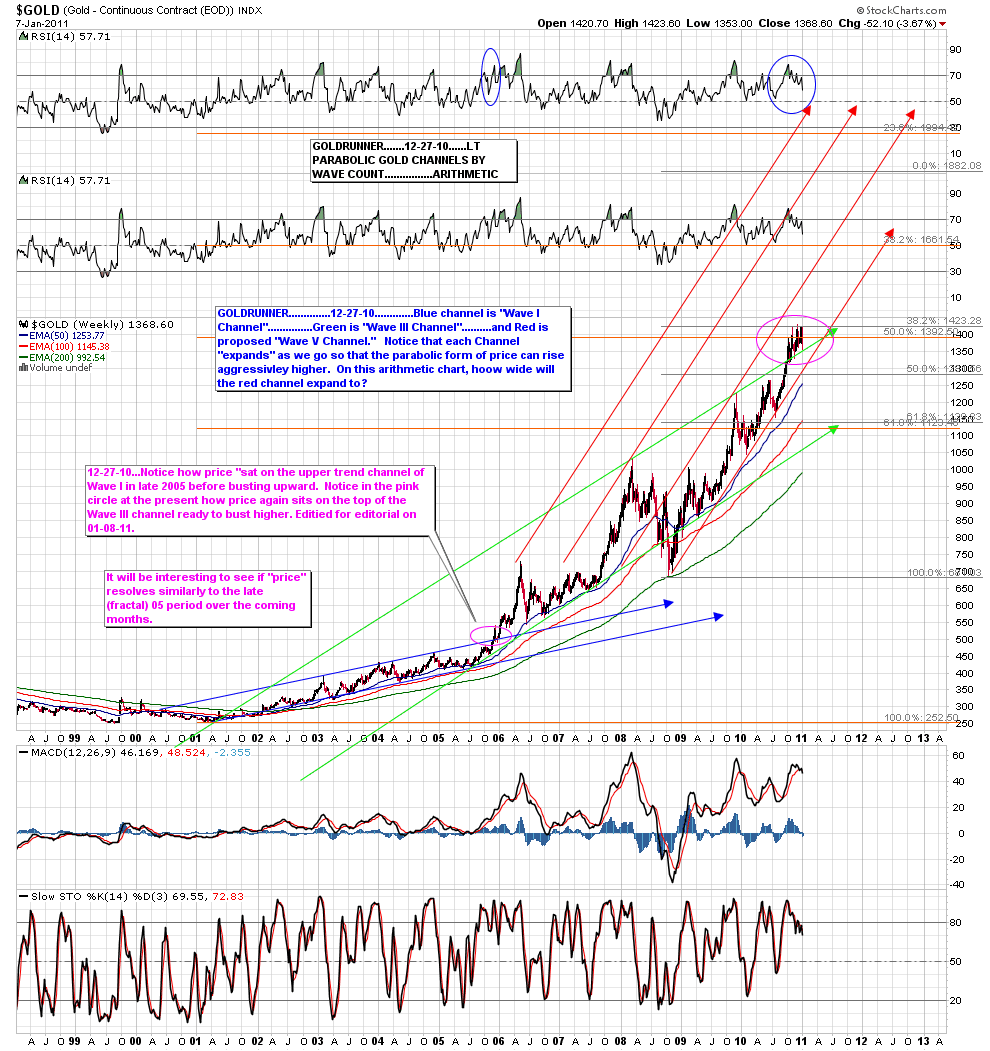 Let’s take a look at the Gold Chart that we think is almost as significant as the Fractal Gold Chart we follow off of the late 70’s. The chart, below, is an arithmetic chart of $Gold. We have drawn the channels that correspond to the basic Elliot Wave structure of the developing Gold parabola. The equivalent of the Wave I channel is drawn in blue. The equivalent of the Wave III channel is drawn in green. And the proposed Wave V channel is drawn in red.