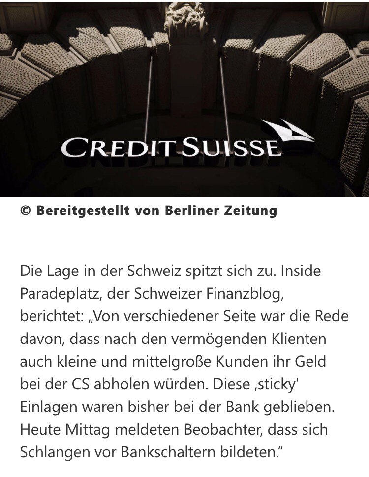 Also wenn ich bei der CS ein Konto hätte, egal ob schwarz oder legal, dann würde ich die Kohle dort schleunig runter holen. Da die Nachrichten nun gerade in der Öffentlichkeit eintrudeln werden wohl viele andere auch auf diese Idee kommen, das wird noch interessant.