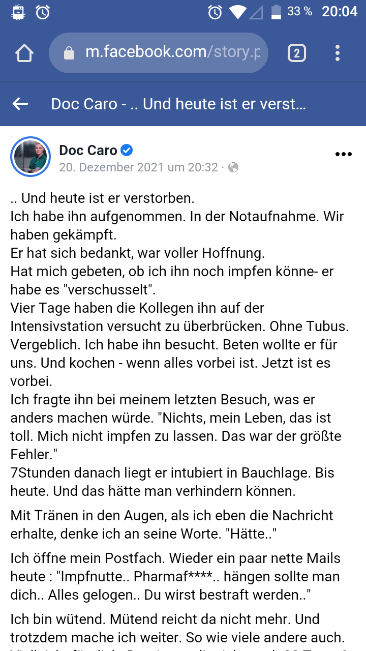 Evtl hat der eine oder andere schonmal von "Doc Caro" gehört. Eine Anestäsistin und Notarztmedizinerin, die im Oktober 2019 bekannte wurde und immer mal wieder in Talkshows auftaucht, um vor allem über ihren Alltag mit Coronapatienten zu berichten.