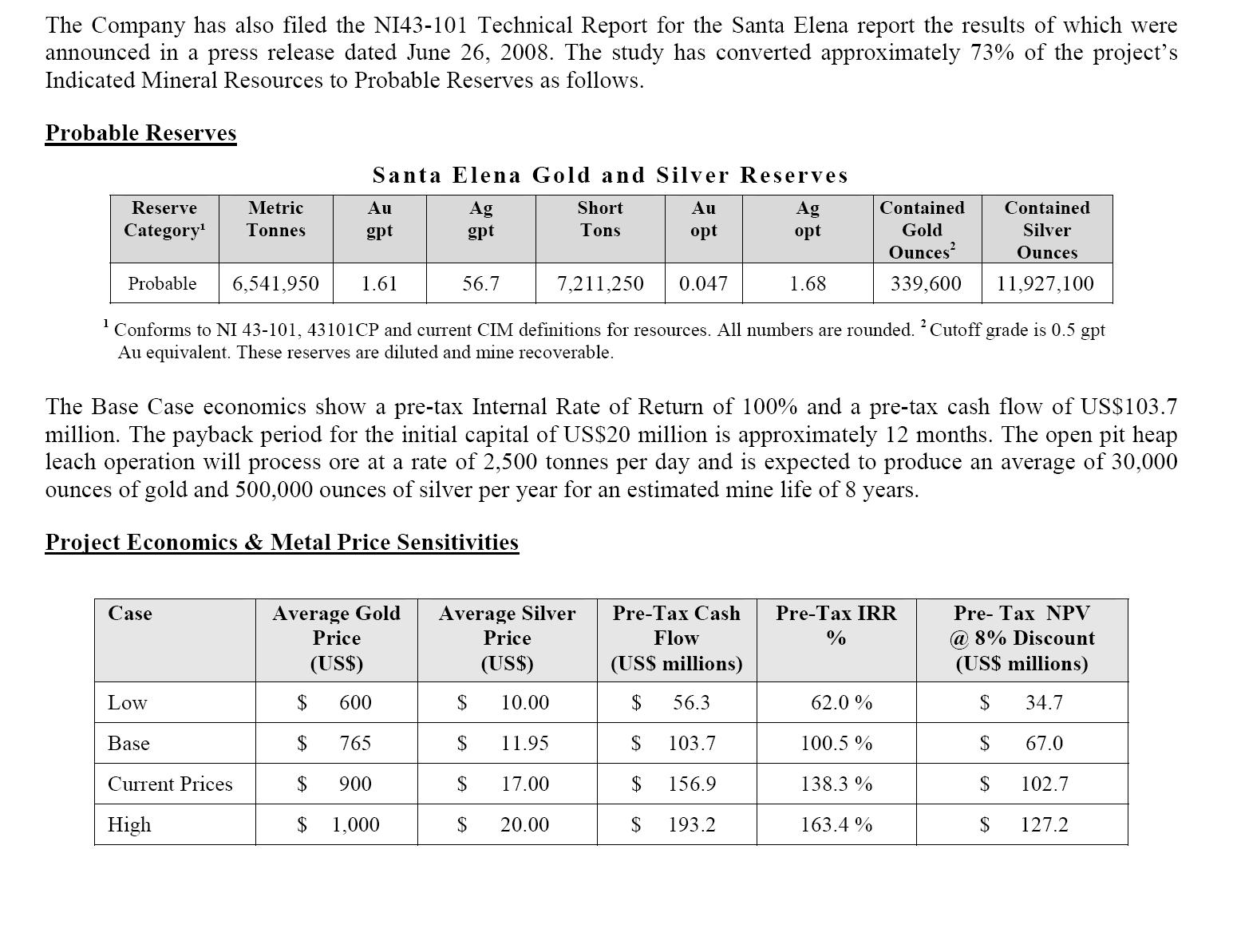Selbst das für "Low"-Szenario für Santa Elena (600 POG, 10 POS) wird ein Pre-Tax Cash-Flow von 56,3 Mio. USD für das Projekt errechnet. Die Studie ist vom August, also höchstaktuell. Die Kapitalkosten für die Produktionsaufnahme werden auf 20 Mio. USD geschätzt. Für den Produktionsstart ist Q2 2009 angepeilt. Die Finanzierung über Schulden dürfte eigentlich kein Problem sein, hoffe nur sie müssen nicht allzuviel hegden zur Absicherung. Des weiteren soll im Oktober eine neue Ressourcenschätzung kommen, in die weitere 50 Bohrlöcher einfließen.